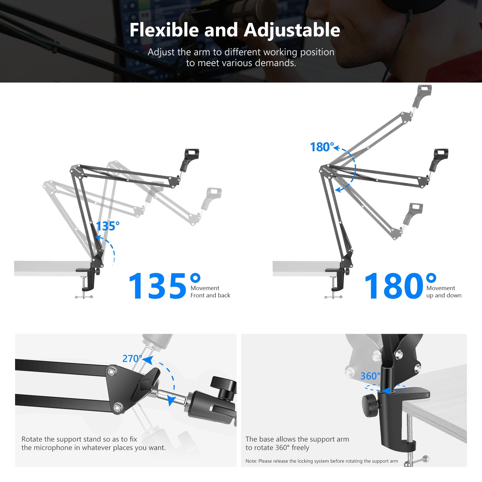 - Adjustable Microphone Boom Arm- Conveniently adjust the angle and height of this mic boom arm to suit your vocal recording need—just loosen the adjustment knob and adjust the boom arm. It’s also easy to fold up and carry. Perfect for stage/studio recording, broadcasting, TV stations, and more