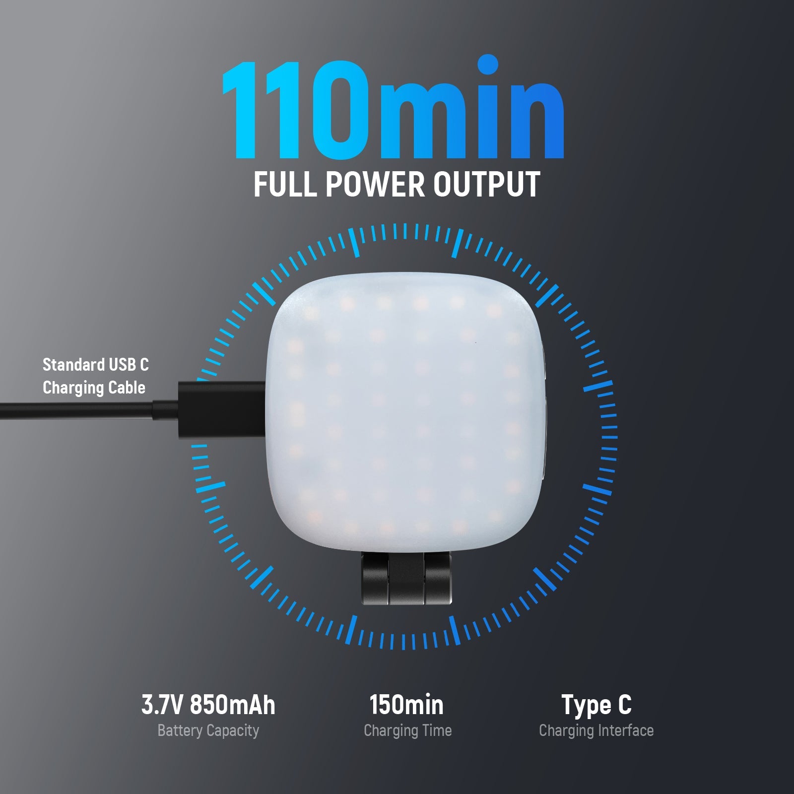 - 110min Long Runtime & Quick USB C Charging- The 850mAh rechargeable battery enables the small LED ring light for phone to operate for 110 minutes at 100% brightness. A full recharge takes only 150 minutes through a portable charger or laptop gear using the included USB Type C cable. A portable circle lighting device with long lasting battery life, perfect to film extended immersive selfies, video recording, filming, videography, and photography on the go