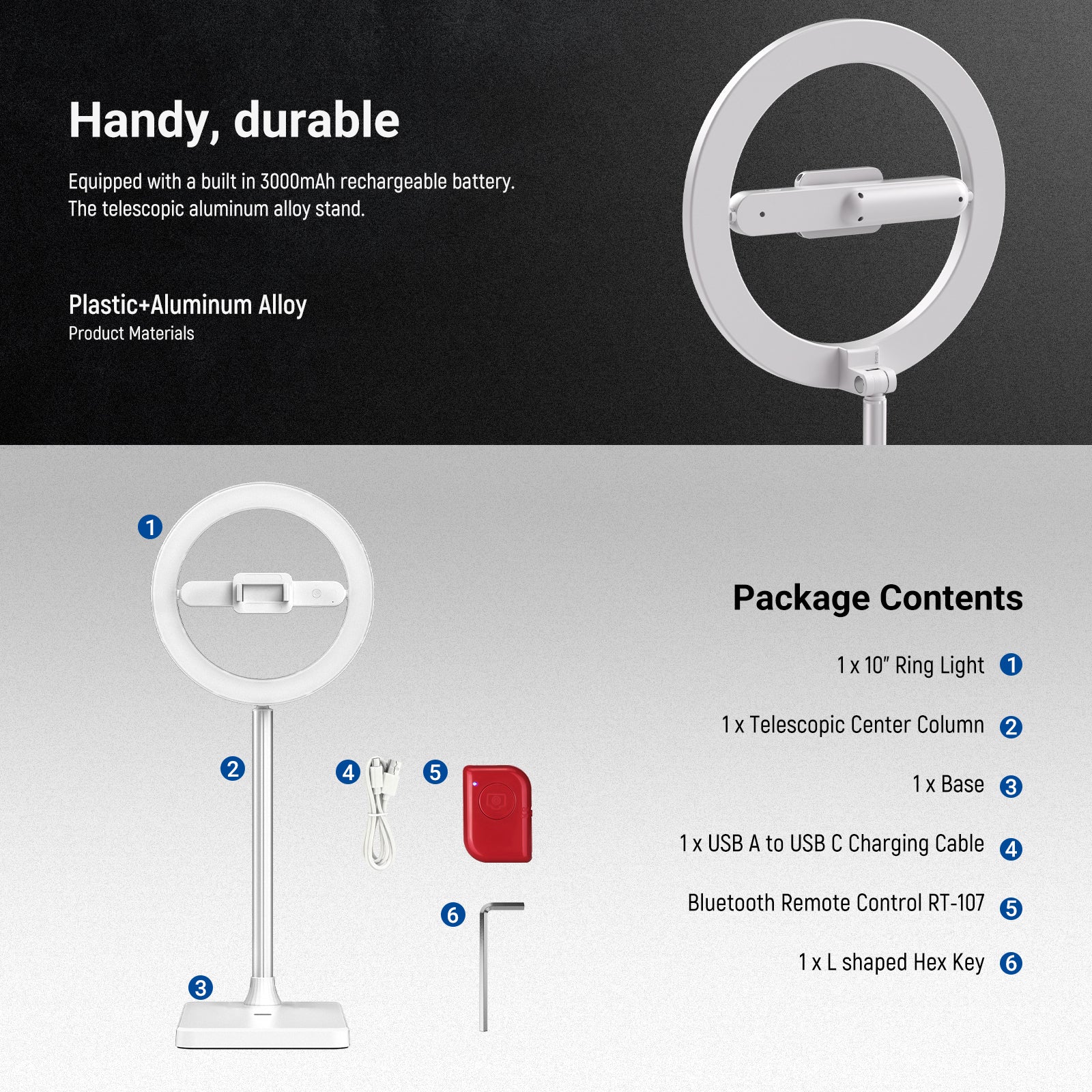 - Ring Light Diameter: 10""/25cm