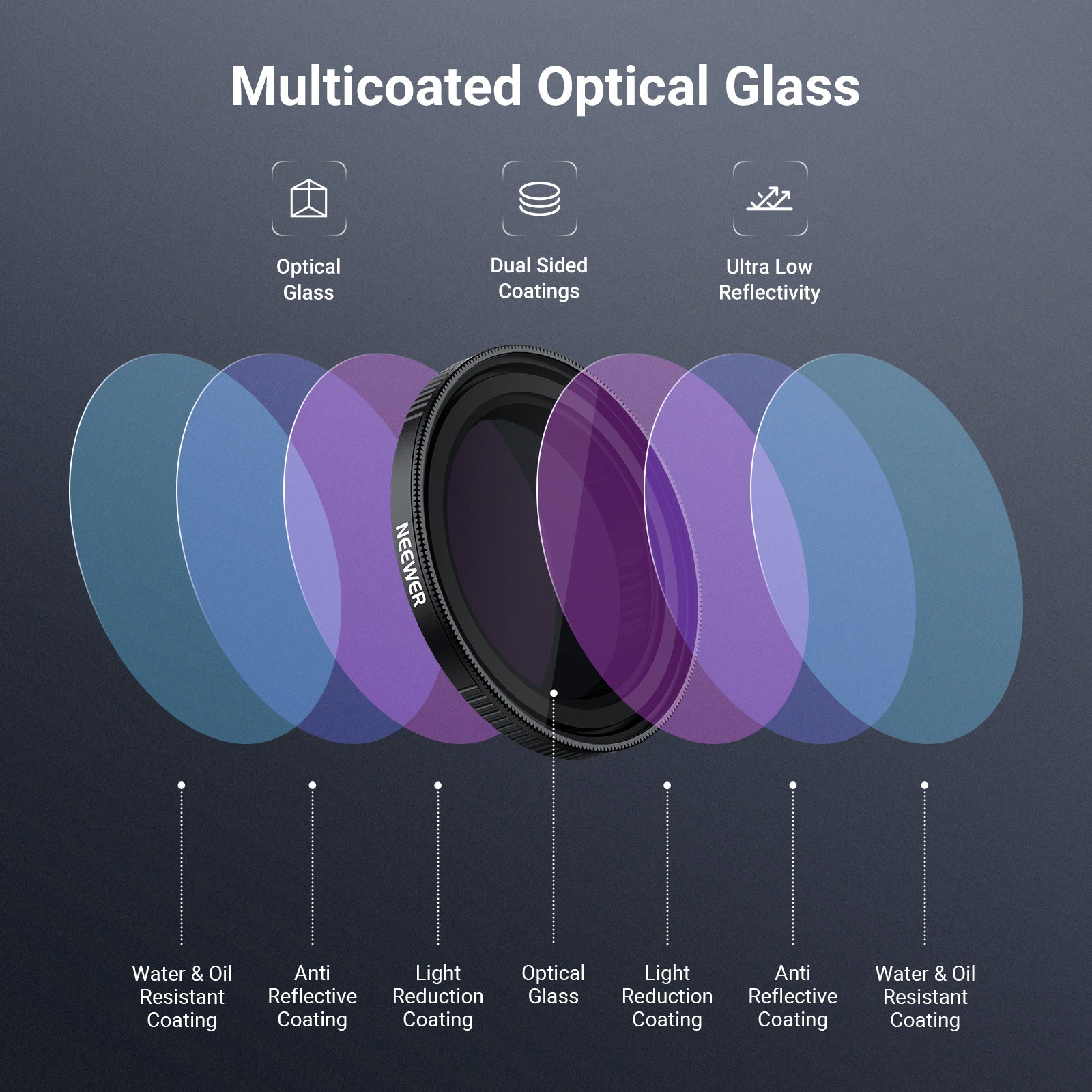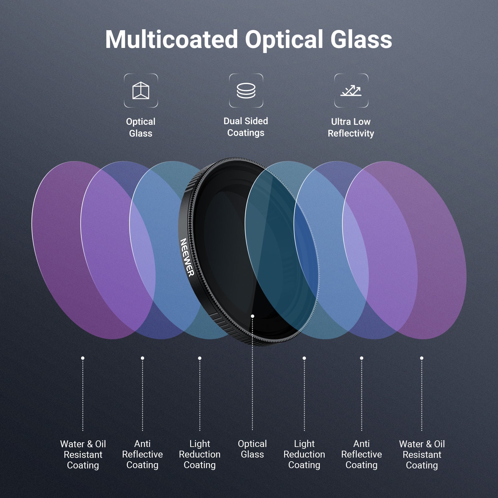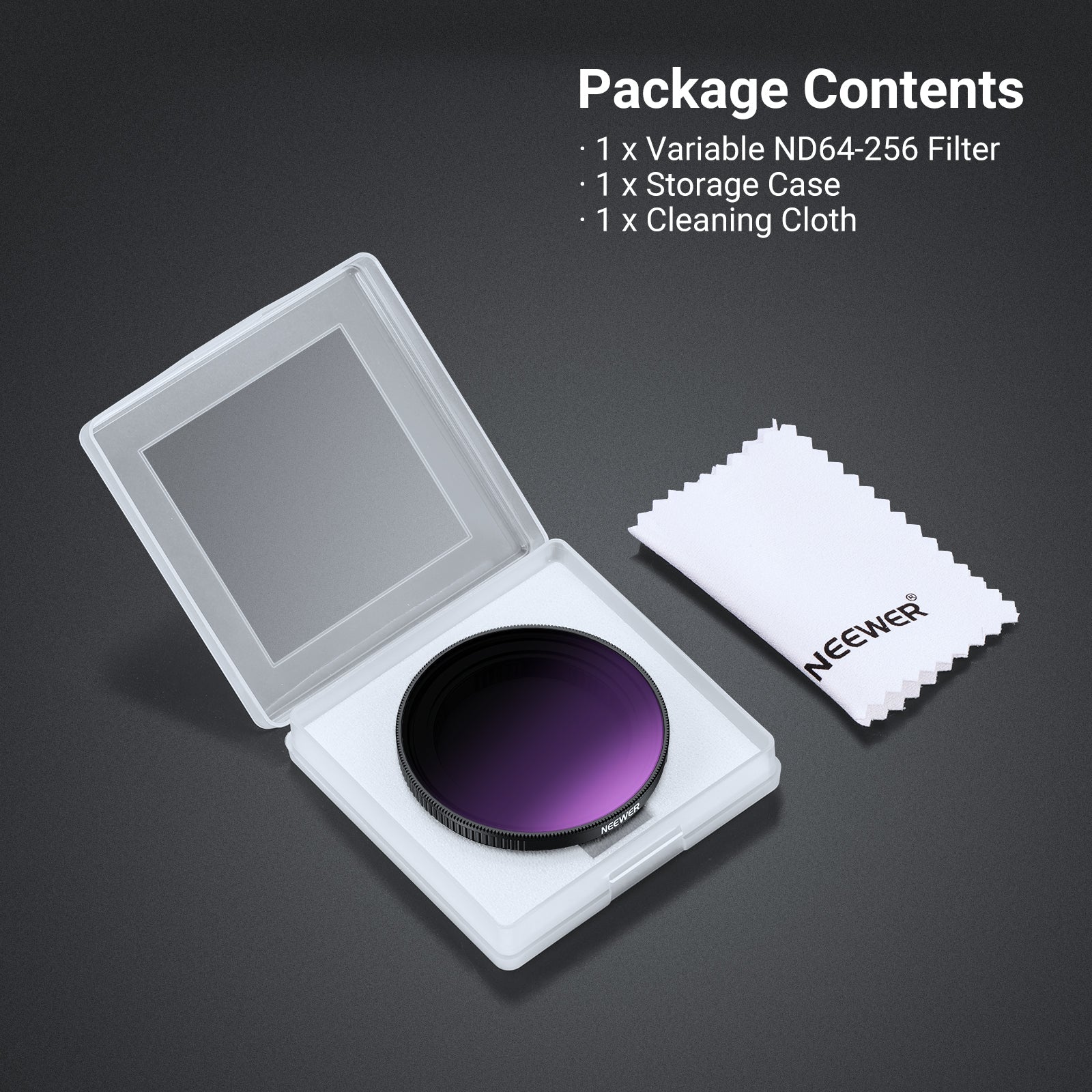 - Flexible Exposure Control- Variable ND2-32 filter cuts light by 1-5 stops to prevent overexposure in various conditions while adding dynamic motion blur effects. Rotate the frame for accurate ND adjustment