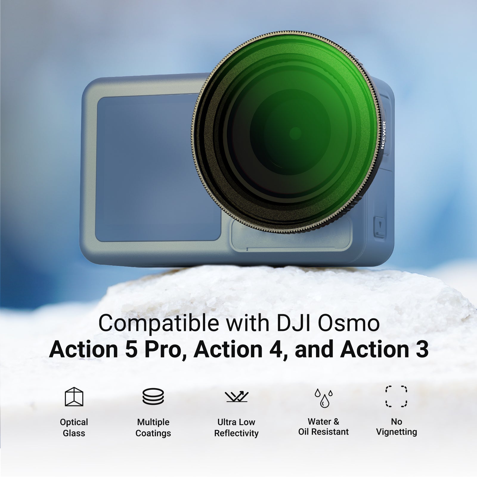 - Made for Action 5 Pro/4/3- Compatible with DJI Osmo Action 5 Pro, Action 4, and Action 3 Adventure Combo Accessories. This variable neutral density filter is a content creator essential and influencer must have for POV action camera shots