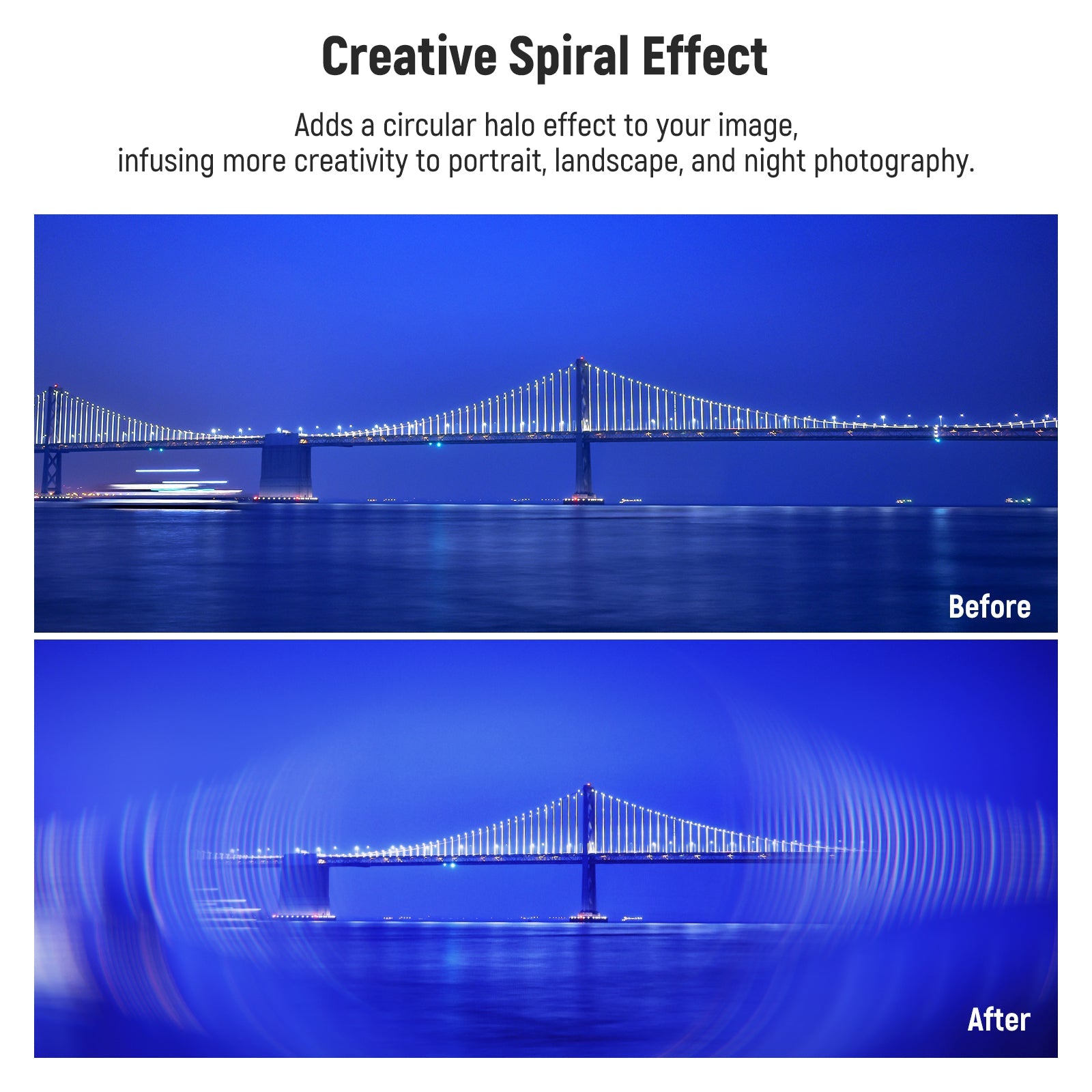 - Enchanting Spiral Halo Effect- This prism effect filter frames your shots with a circular halo, keeping the image clear at the center stage while transitioning the background into a swirling, magnified blur, intensifying the mood and atmosphere without further post editing