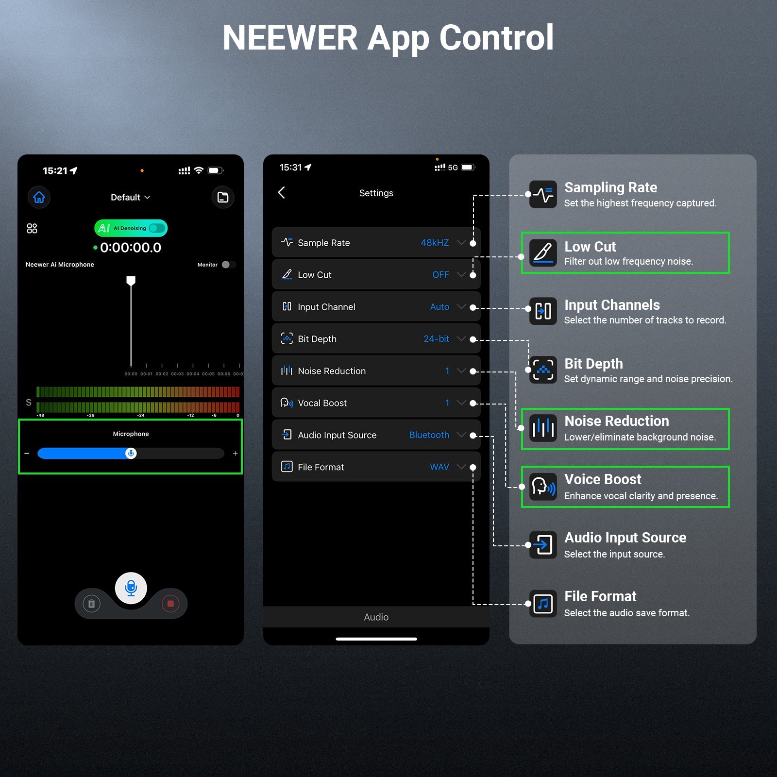 - 2 Level AI Noise Cancellation- DSP & MCU dual chips enable 2 AI noise cancellation levels (A1 & A2) to minimize noise from traffic, wind, interference, and other situations. 32Bit float is available when noise cancellation is on. Mute the mic with 1 press. Use NEEWER MIC app for advanced audio adjustment