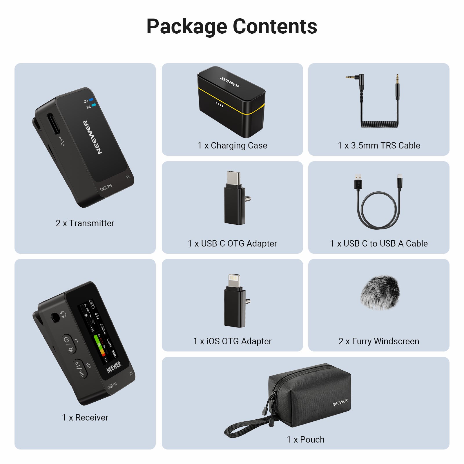 - Wireless Clip On Lav Mic- This lavalier microphone system includes 1x plug & play receiver, 2x transmitter, and 1x charging case. USB C ports with OTG adapters and 3.5mm audio cable are compatible with iPhone iPad Android phones tablets cameras PC computers laptops
