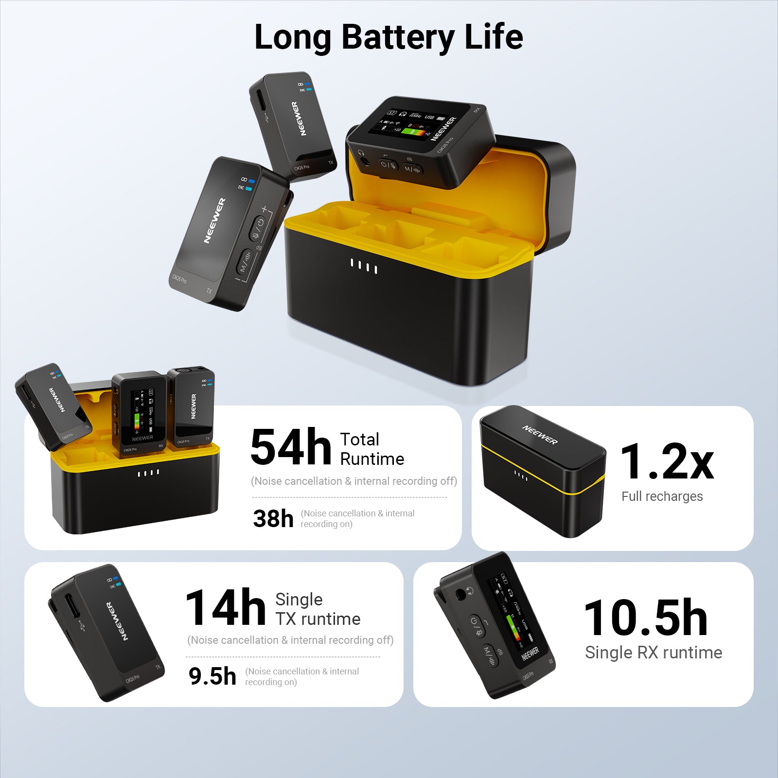 - Long Battery & Transmission- Total runtime is up to 50 hours for a whole day, and the charging case fully charges TX and RX 1.5–1.8 times. Stable 330ft/100m forward and 98ft/30m backward transmission in open, unobstructed areas