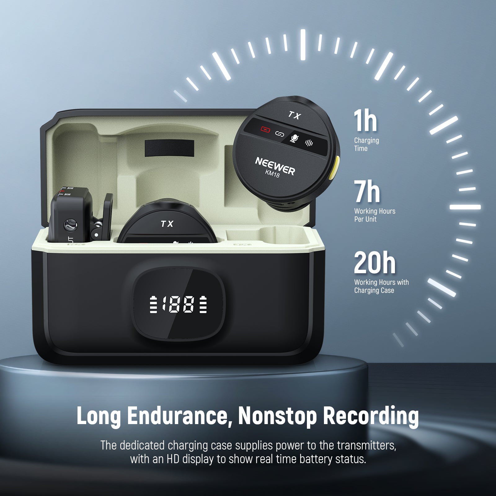 - Charging Case & Long Runtime- The portable charging case not only stores and protects the micro phone units, but also recharges them twice—providing a total runtime of 18-20 hours for long day long. The receiver and transmitters can last 6-7 hours per full charge for extended outdoor recording sessions. The case also features a display showing battery status of each unit
