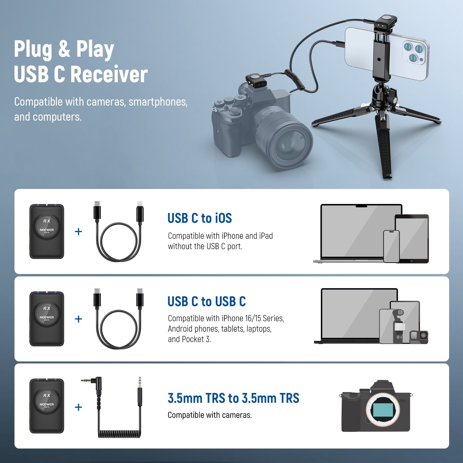 - Plug & Play USB C Receiver- Directly clip the RX on your DSLR camera's cold shoe, and connect to it with a 3.5mm TRS cable. With two included OTG adapter cables, the RX is also compatible with iPhone 16 USBC 15 Pro Max Mac iPad Samsung, USB type C Android cell phones and tablets, computers, and laptop equipment. Content creator essential portable tiny little lav microphone accessories and influencer must have small external mic gear for podcast, vlog, video recording, vlogging, filming, etc