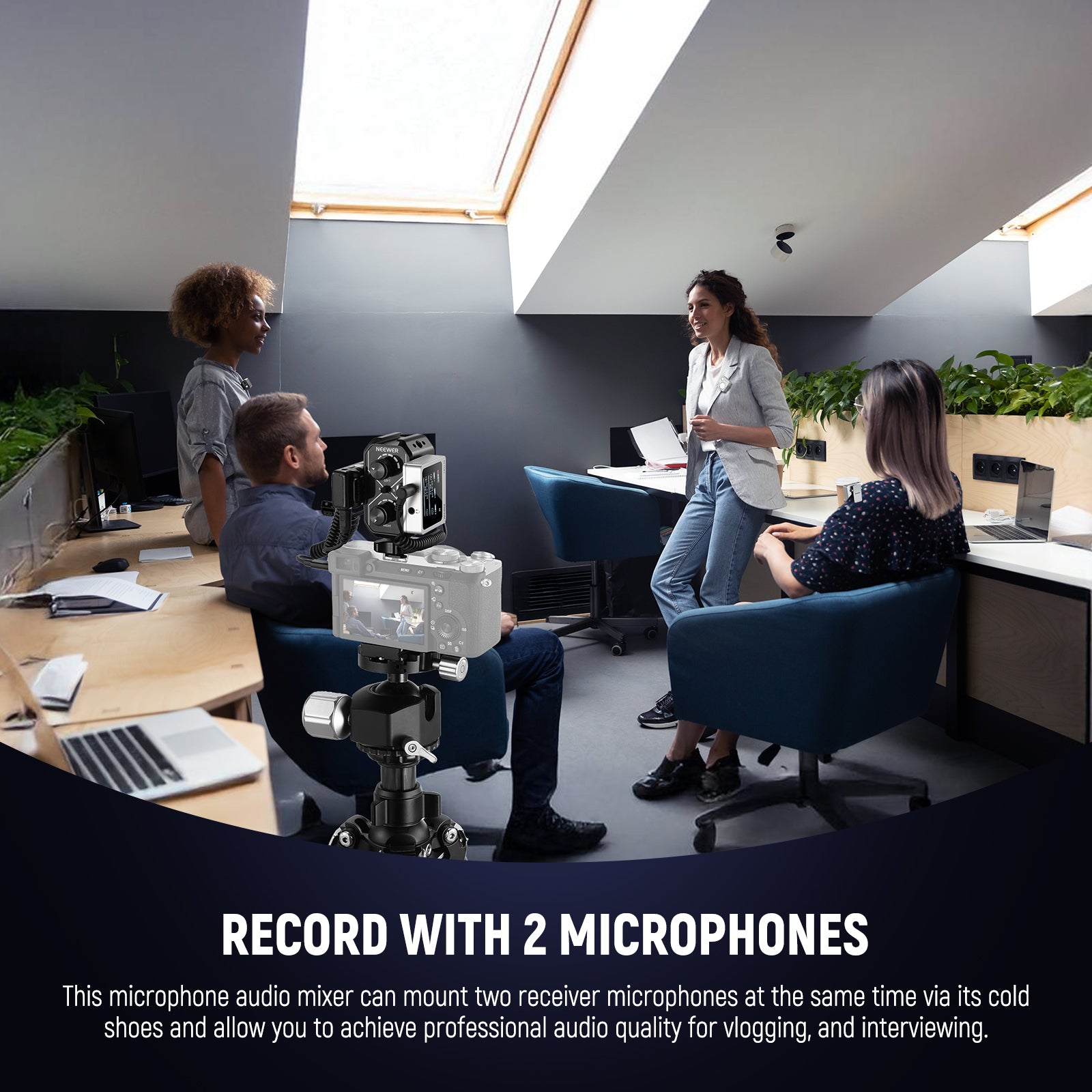 - Record with 2 Microphones- This small microphone audio mixer can mount two microphones at the same time via its cold shoes and allow you to achieve professional and flawless audio quality for filming, vlogging, podcast, and interviewing