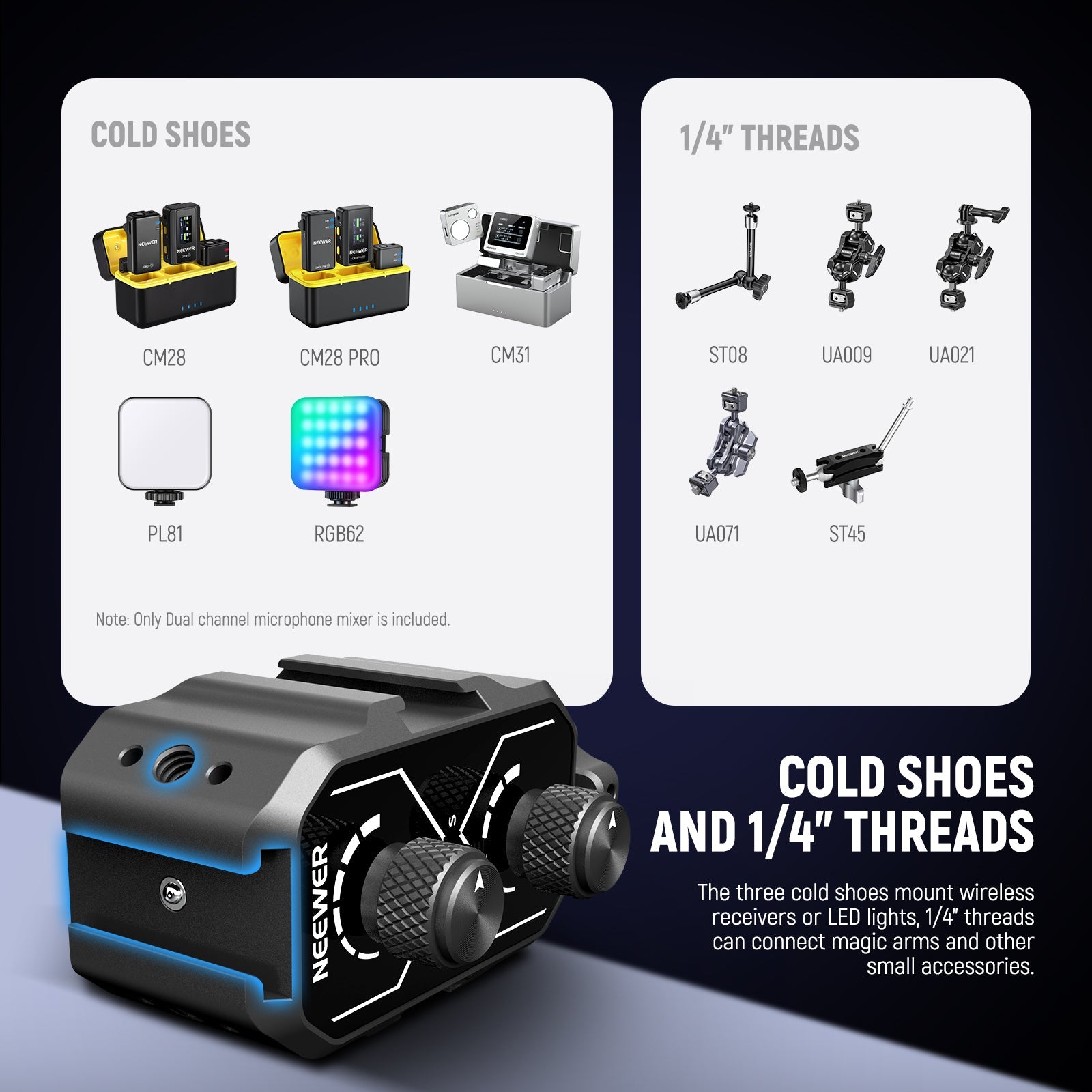 - Cold Shoes & 1/4" Threads- Attach the mixer to your camera via a cold shoe adapter and secure with the thumb wheel. The three additional cold shoe brackets allow mounting of wireless receivers (NEEWER CM31, CM28, CM28 PRO, and more) or LED lights (NEEWER PL81, RGB62). 1/4" threads can connect magic arms and other small photography gear or accessories as content creator essential and influencer must have