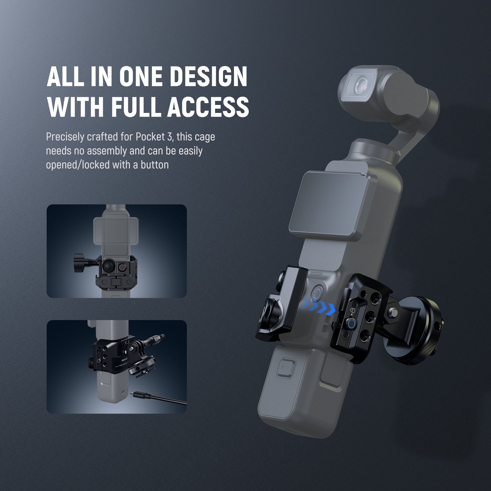 • All In One Design with Full Access- Precisely crafted for Pocket 3, this cage needs no assembly and can be easily opened/locked with a button. The formfitting design ensures full access to buttons and the rotatable screen, and keeps the charging port completely unblocked