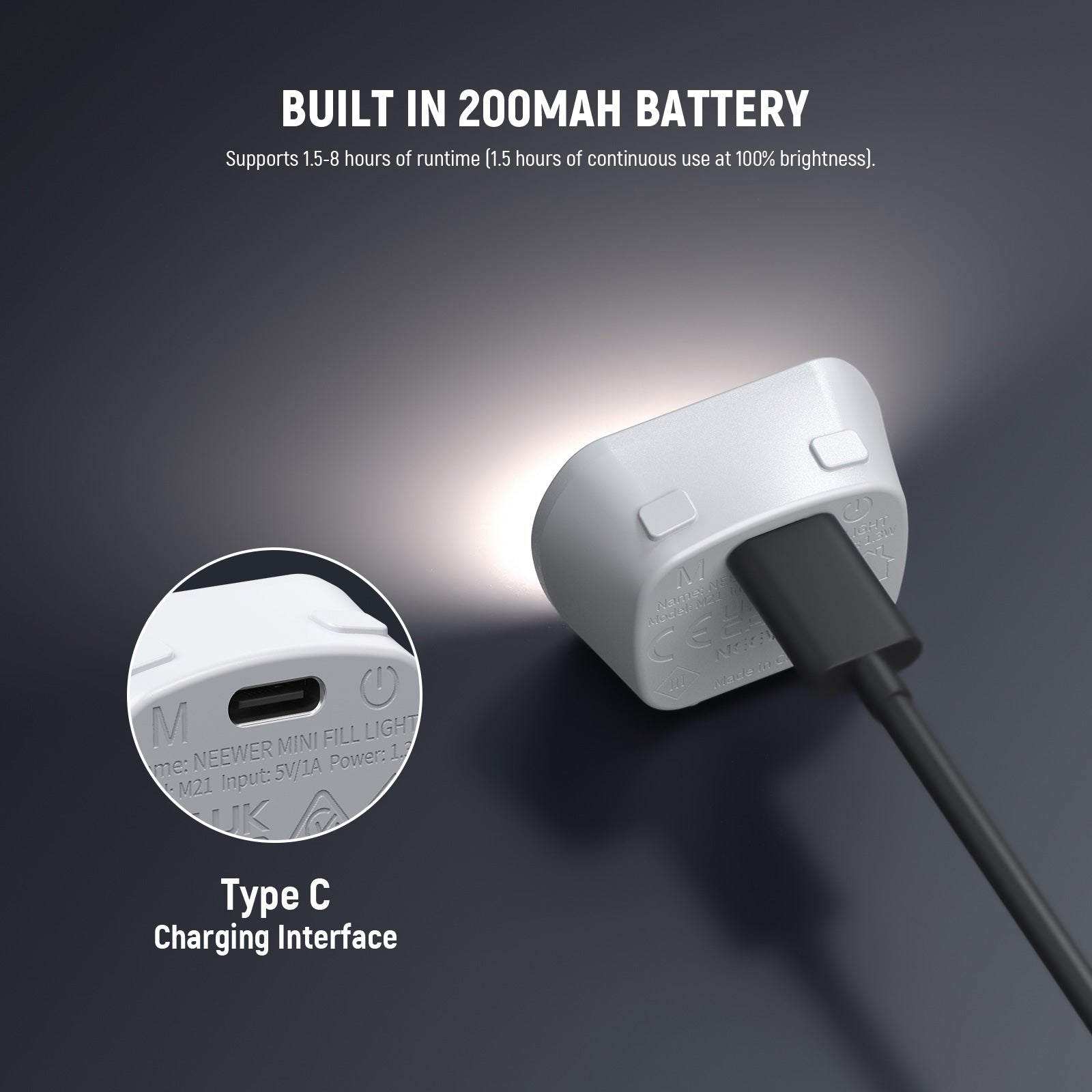 - Built in 200mAh Battery- The LED camera light has a built in 200mAh rechargeable battery, supporting 1.5-8 hours of runtime (1.5 hours of continuous use at 100% brightness). Conveniently recharged using a portable charger or other USB power sources via USB C charging