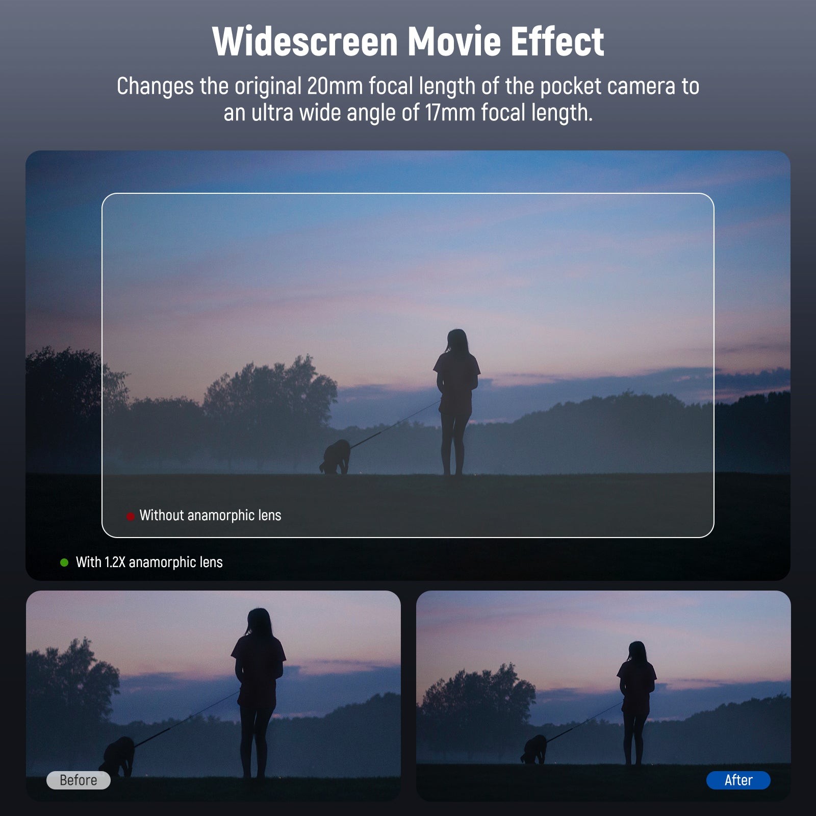 • 1.2x Compression for Immersive Widescreen- NEEWER 1.2x anamorphic lens is seamlessly compatible with DJI Pocket 3 to step into the world of movies. It offers a wider field of view for more scenes to be framed by your pocket camera, creating enticing movie footage like a Hollywood blockbuster. Recommended to use Adobe Premiere, DaVinci Resolve, Corel VideoStudio, etc., for post editing to adjust the video width and tune out the desired effect