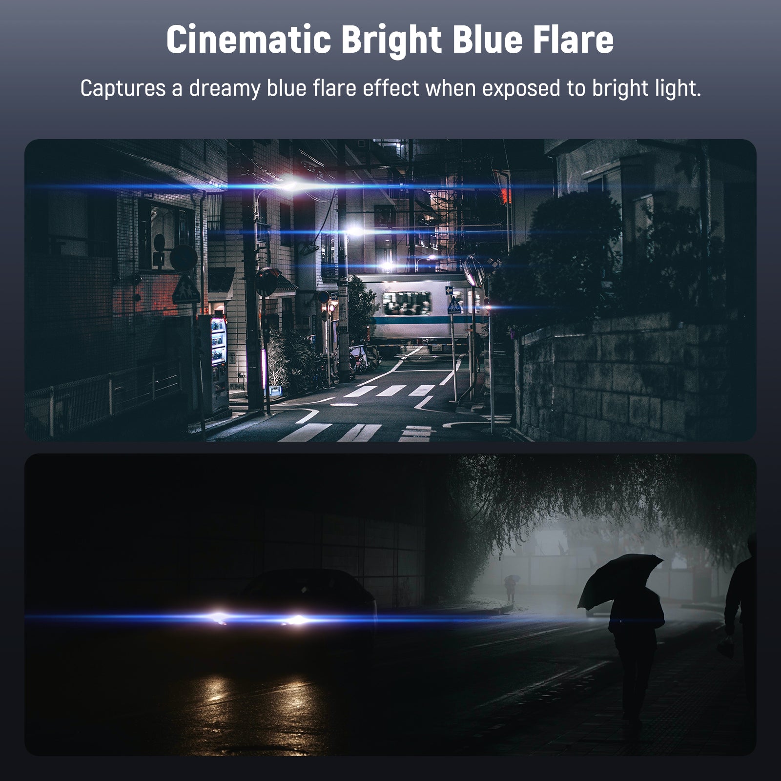 • Cinematic Bright Blue Flare- This anamorphic lens captures a dreamy blue flare effect when exposed to bright light. Bringing a retro cinematic look to your camera, it achieves a brighter and sci fi halo effect that works well when photographing headlights, streetlights, or directional lights
