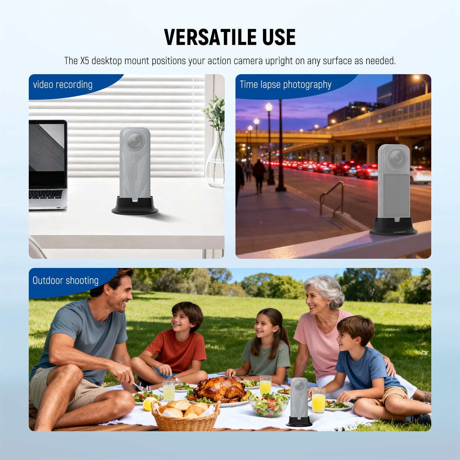 - Versatile Use- The X5 desktop mount positions your action camera upright on any surface, great for on location shots or time lapse photography as content creator essential influencer must have photography accessories and videography gears