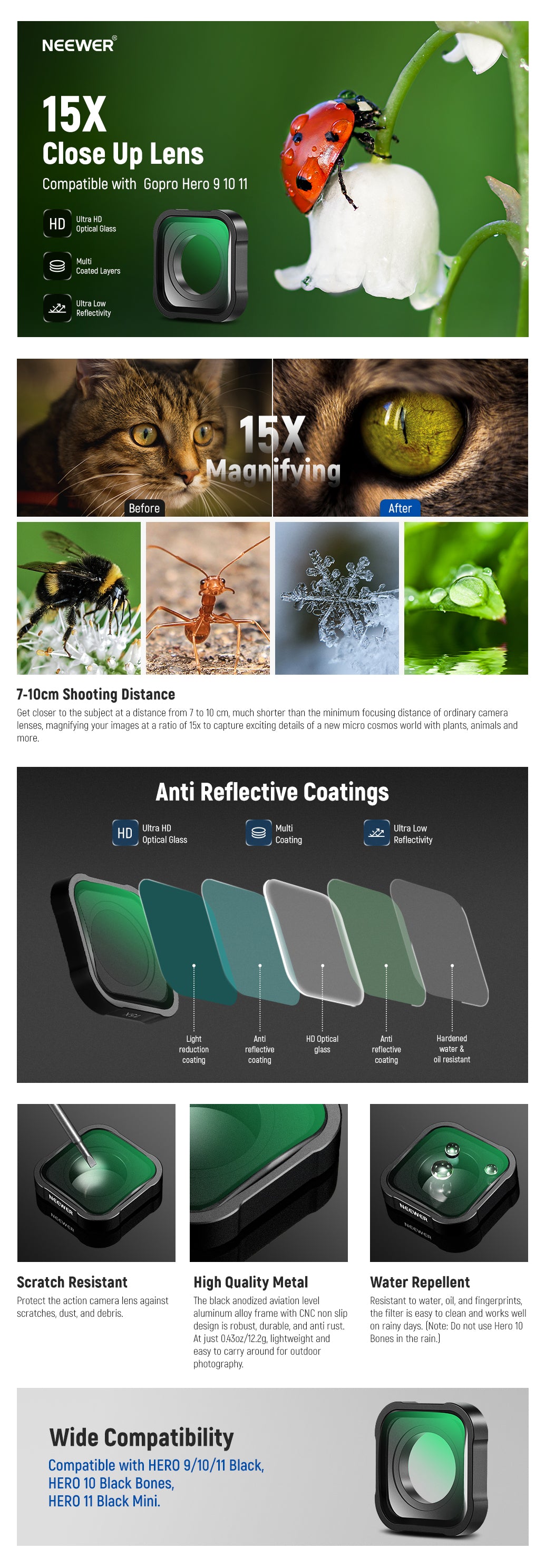 NEEWER LS-31 15X Magnification Lens compatible with GoPro Hero 12 11 10 9 Black