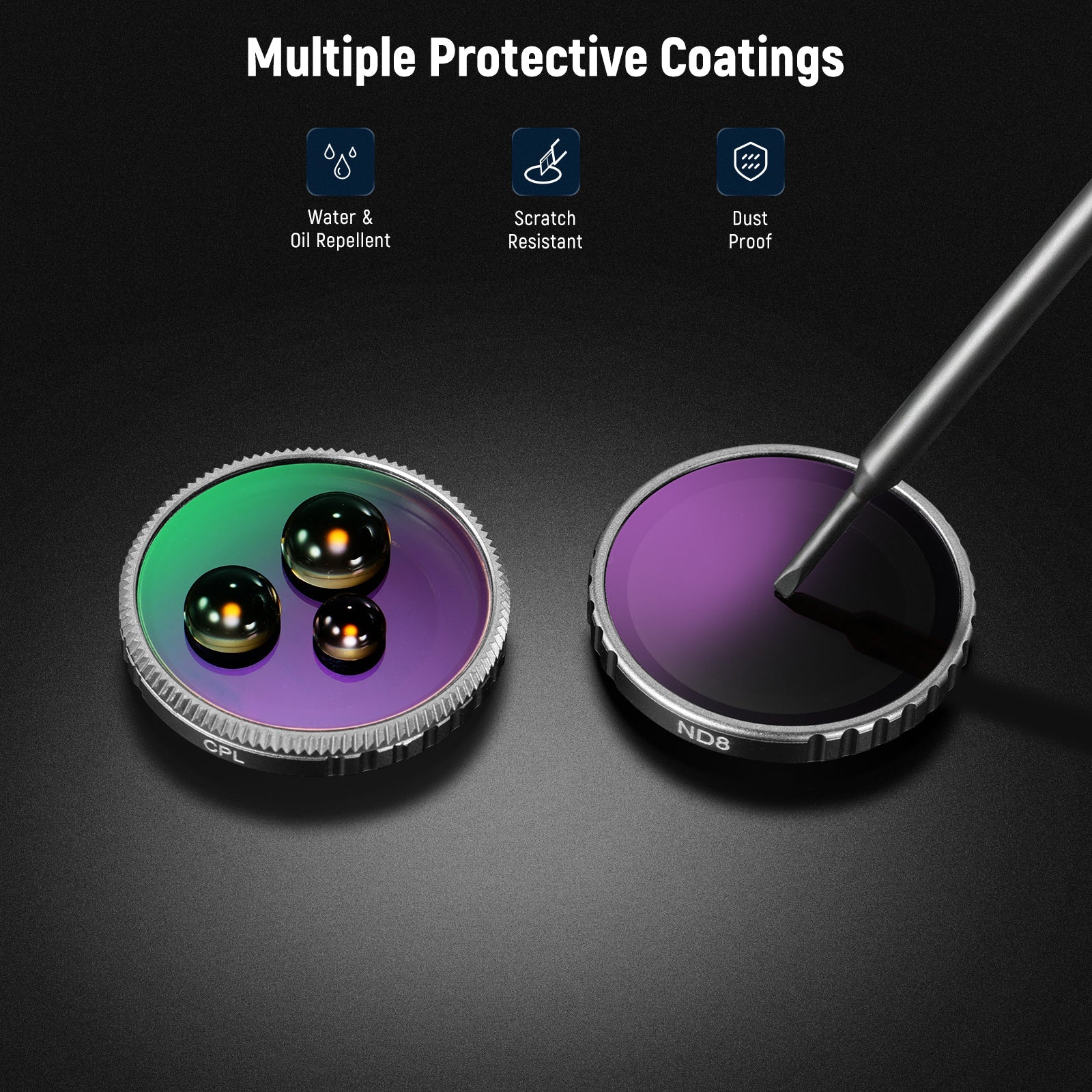 - Easy and Quick Installation- The filters are designed for quick installation by simply unscrewing the existing lens protector and attaching the new filter. The CNC machined aluminum construction ensures durability, and the lightweight design allows for easy portability. The set includes a cleaning cloth and a filter case for efficient storage and protection