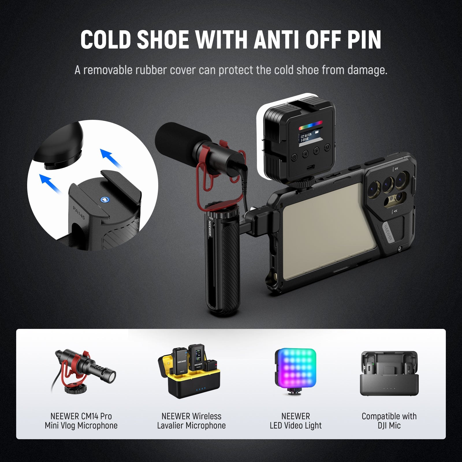 - Capped Anti Off Cold Shoe- The built in cold shoe features a retractable anti off pin and a removable protective cap, compatible with DJI Mic, NEEWER VM10 Microphone, CM28/CM31 Wireless Lavalier Microphone, RGB62 LED Video Light, and other cold shoe accessories