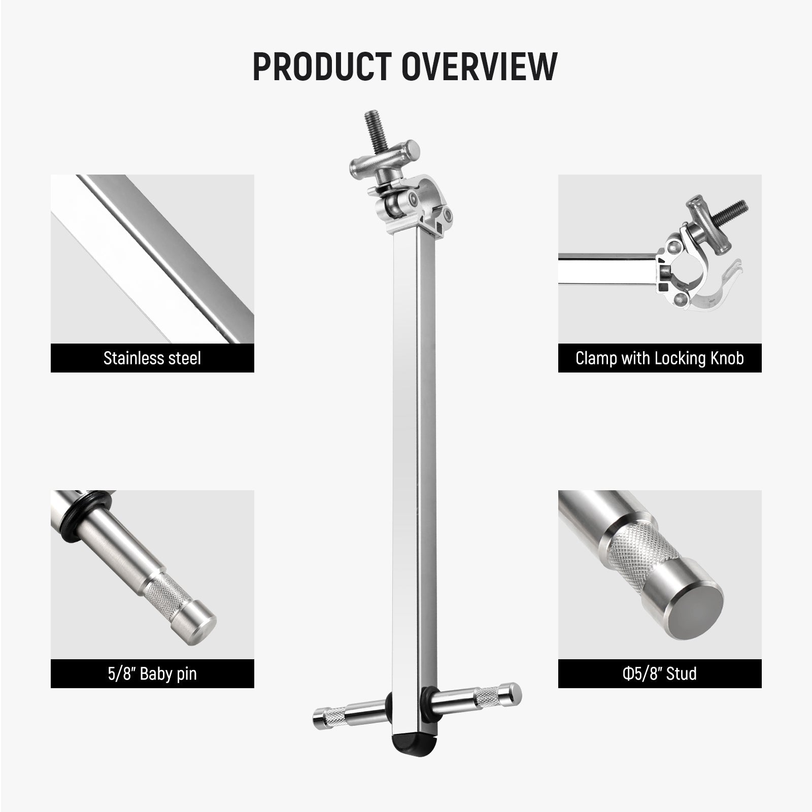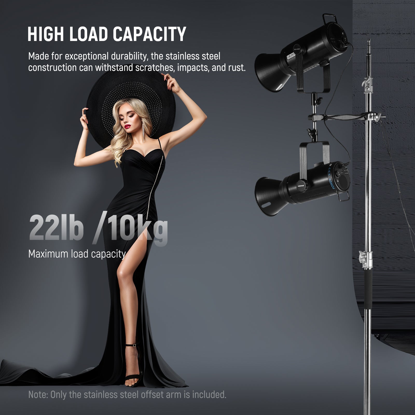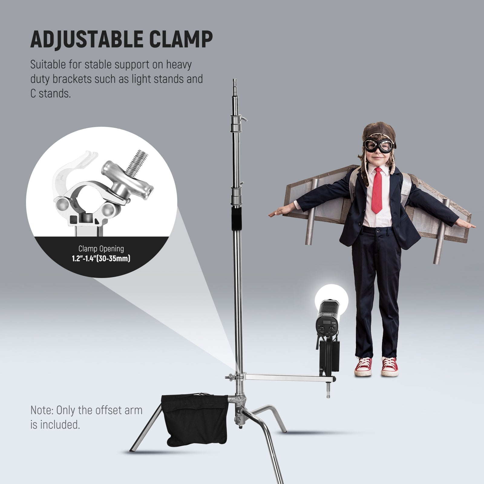 • Baby Pin Offset Arm for C Stands- Secure your light fixtures or accessories 1.5ft/46cm away from the C stands or light stands, with the built in clamp for a secure and stable connection, and the two 5/8" baby pins on the other end to simplify device mounting. You can even hide the light stand behind the background or set wall for a polished, distraction free shooting environment
