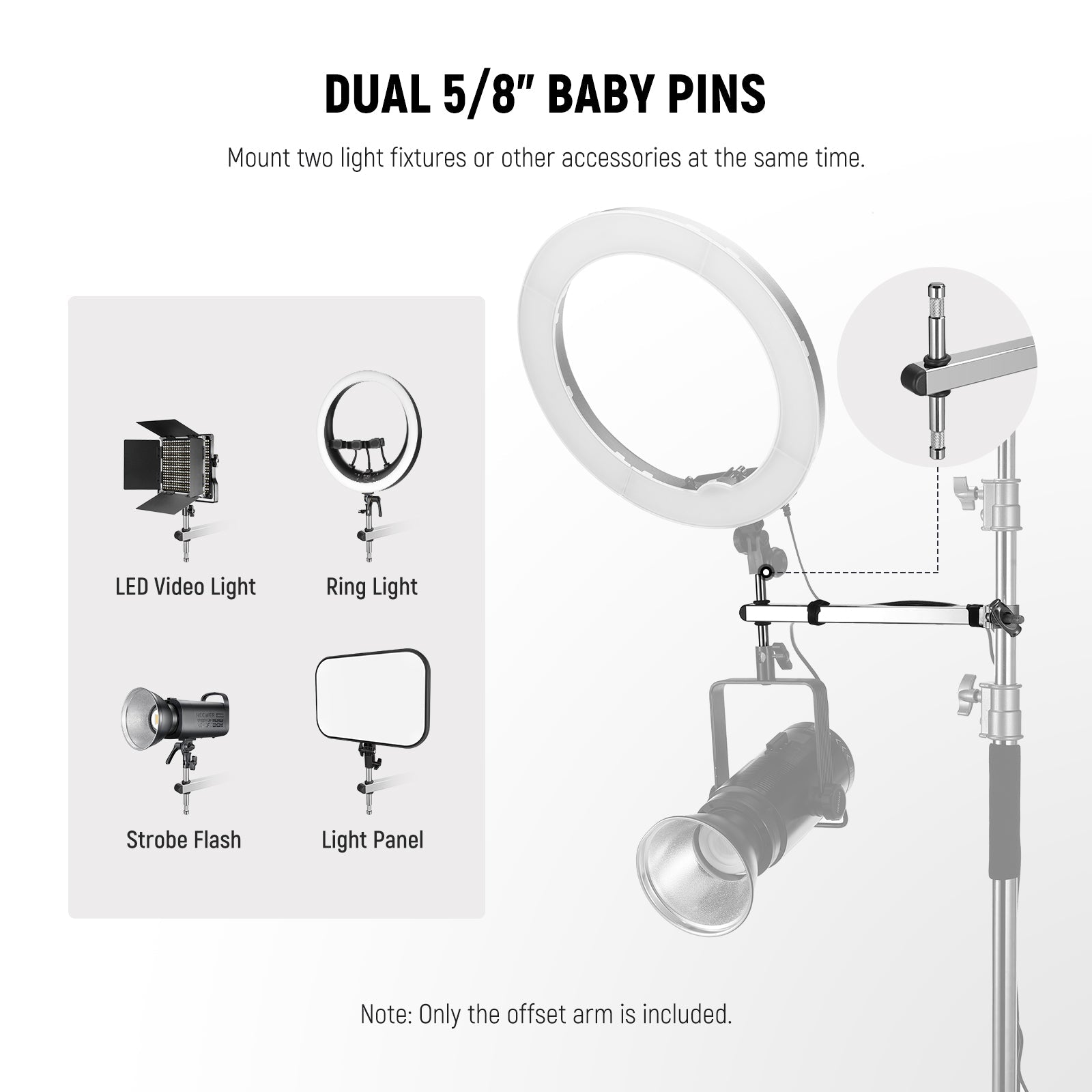 • Dual 5/8" Baby Pins- This offset arm, equipped with dual 5/8" baby pins on one end, can effortlessly be attached to any two devices at the same time, including LED video lights, LED panel lights, ring lights, strobe flashes speedlights, studio lights, mono lights, microphones, reflectors, diffusers, or softboxes (all not included)