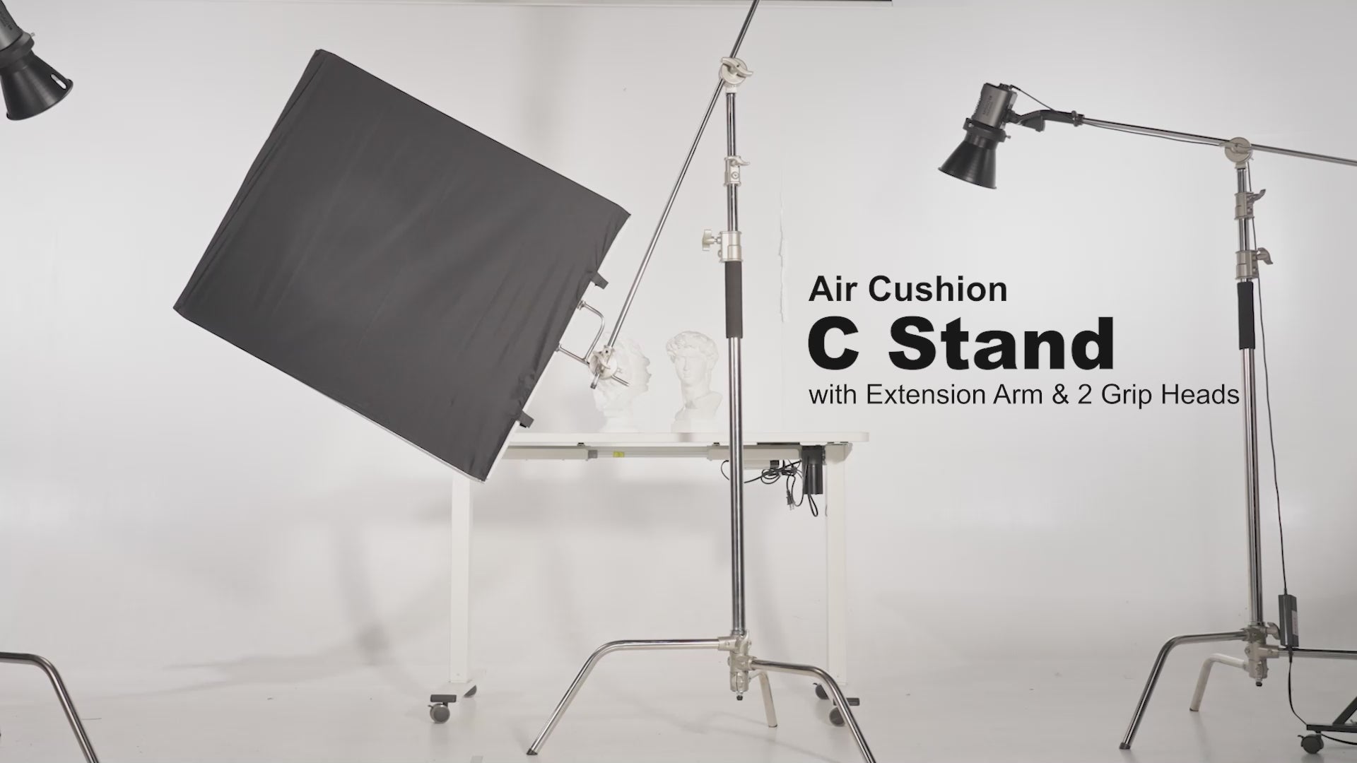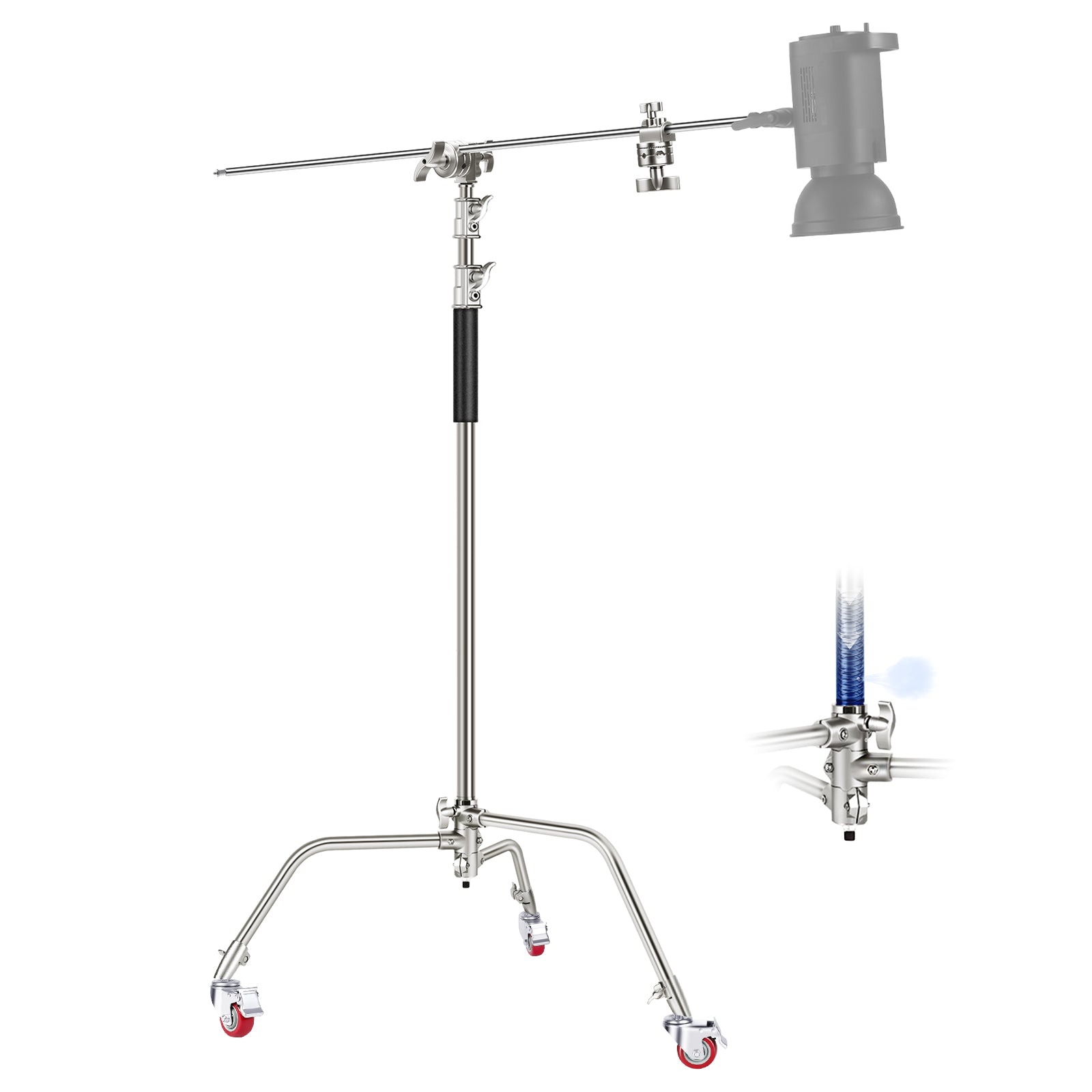 - Heavy Duty Air Cushion Light Stand- Made of 100% robust stainless steel, this C stand can mount strobes, monolights, reflectors, softboxes, umbrellas, and other photography gear with exceptional stability. Internal air cushion and spring design prevent sudden equipment falls, reducing damage risks