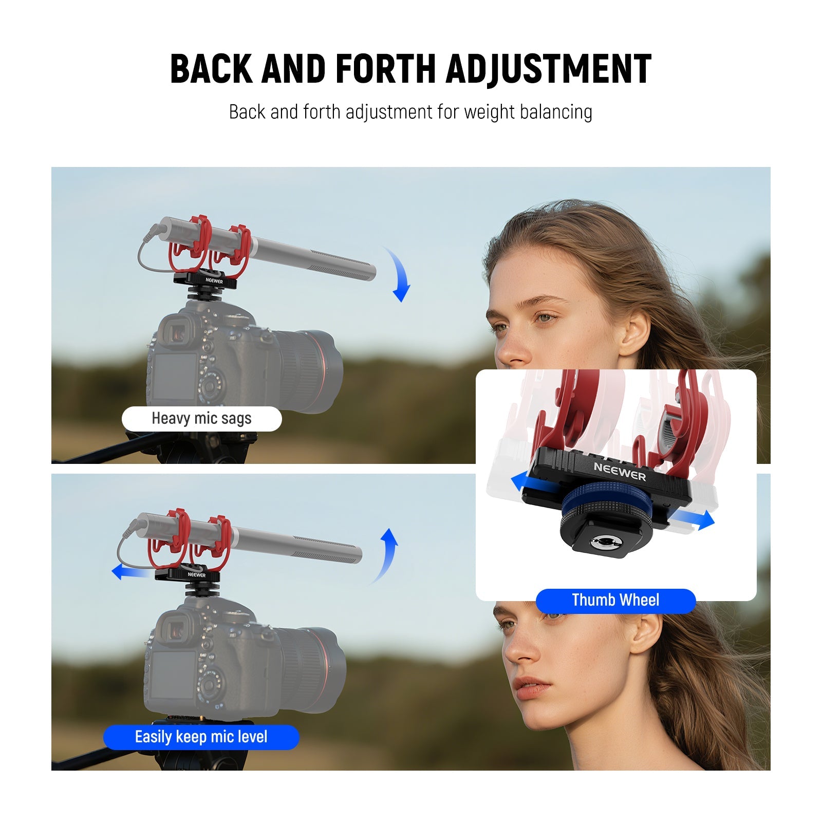 • Universal Cold Shoe & 1/4" Thread- The cold shoe mount and 1/4" thread can connect to cameras, rigs, boom poles, and tripods. It also supports back and forth positioning for weight balancing