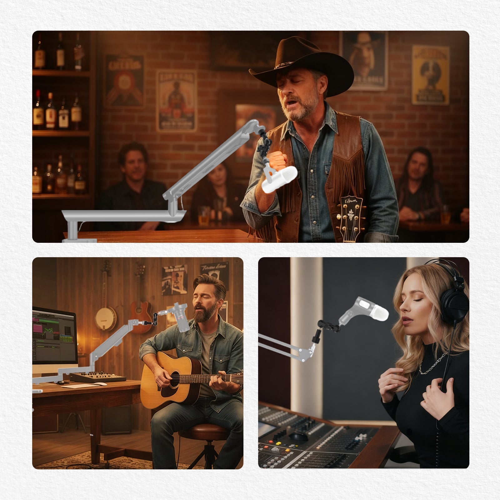 - Mic Mount Adapter with 360° Ball Heads- The microphone stand adapter features a magic arm with two 360° rotating ball heads, allowing for 360° swivel and 180° tilt for flexible and precise mic positioning