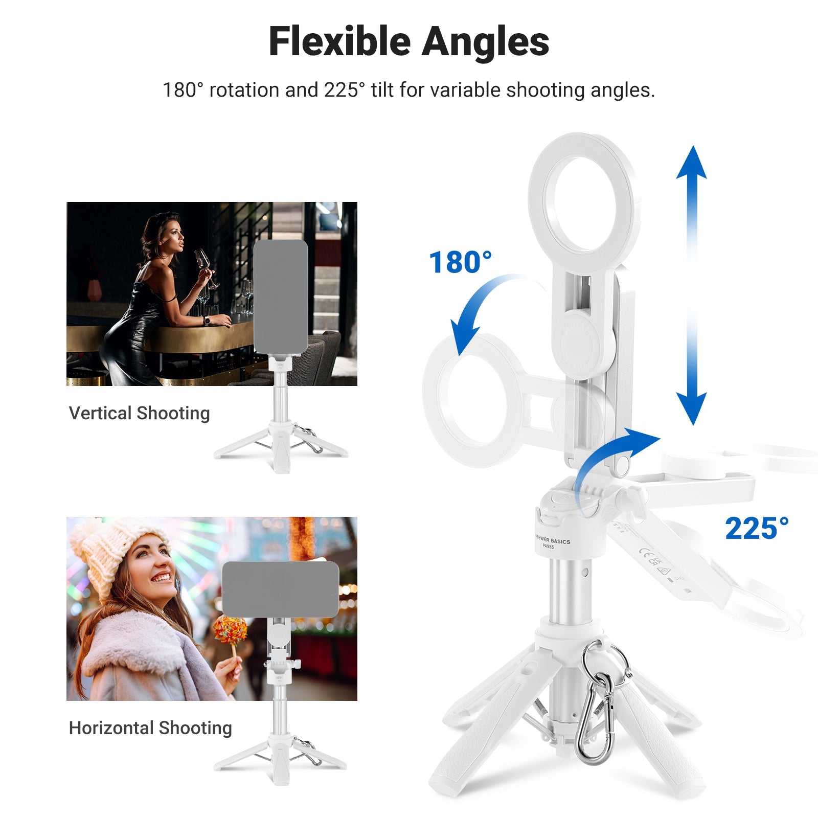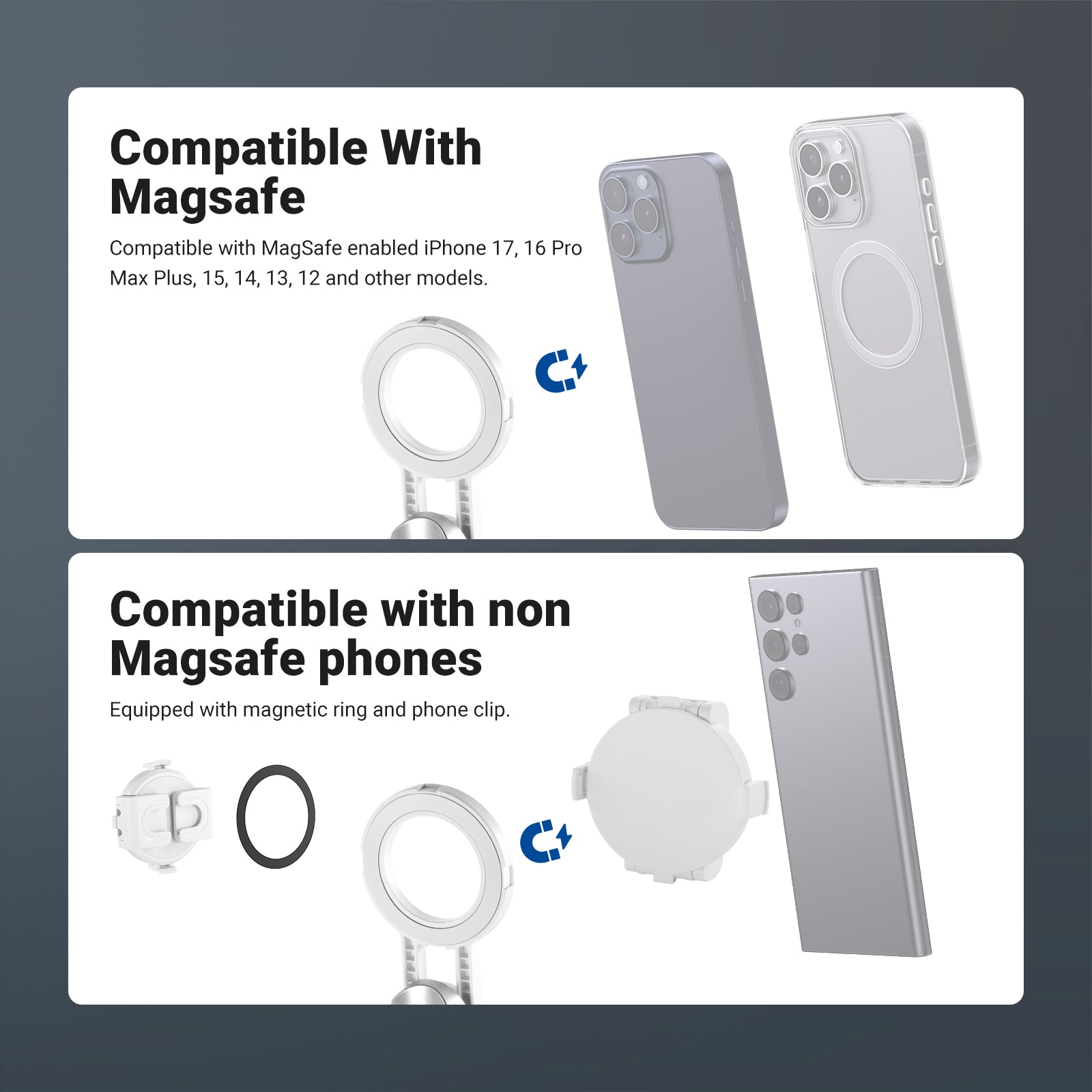 - 360° Universal Phone Holder- With a 2.4"-3.3"/60-85mm opening range, the phone clamp is compatible with iPhone 16 Pro Max iPhone 15 Pro Max Samsung Galaxy S24 Ultra and other smartphones. The 360° rotation allows for vertical and horizontal shooting, while the 225° tilt offers variable camera angles