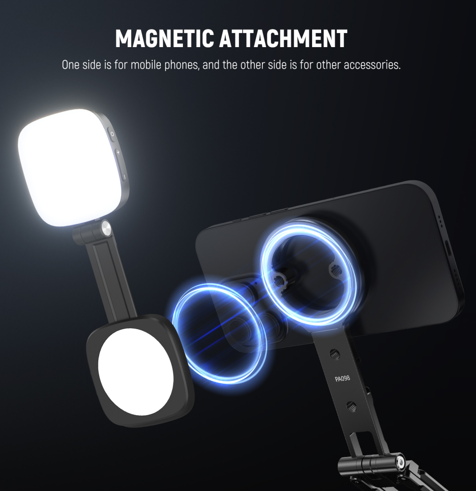 Magnetic Phone Mount- The magnetic phone holder features a magnetic design, with one side that securely attaches to smartphones (limited to magnetic smartphones only, not compatible with other accessories), and the other for use with the magnetic fill lights and more. The strong magnetic grip ensures the stability of your cell phone during shooting, significantly reducing the risk of accidental drops