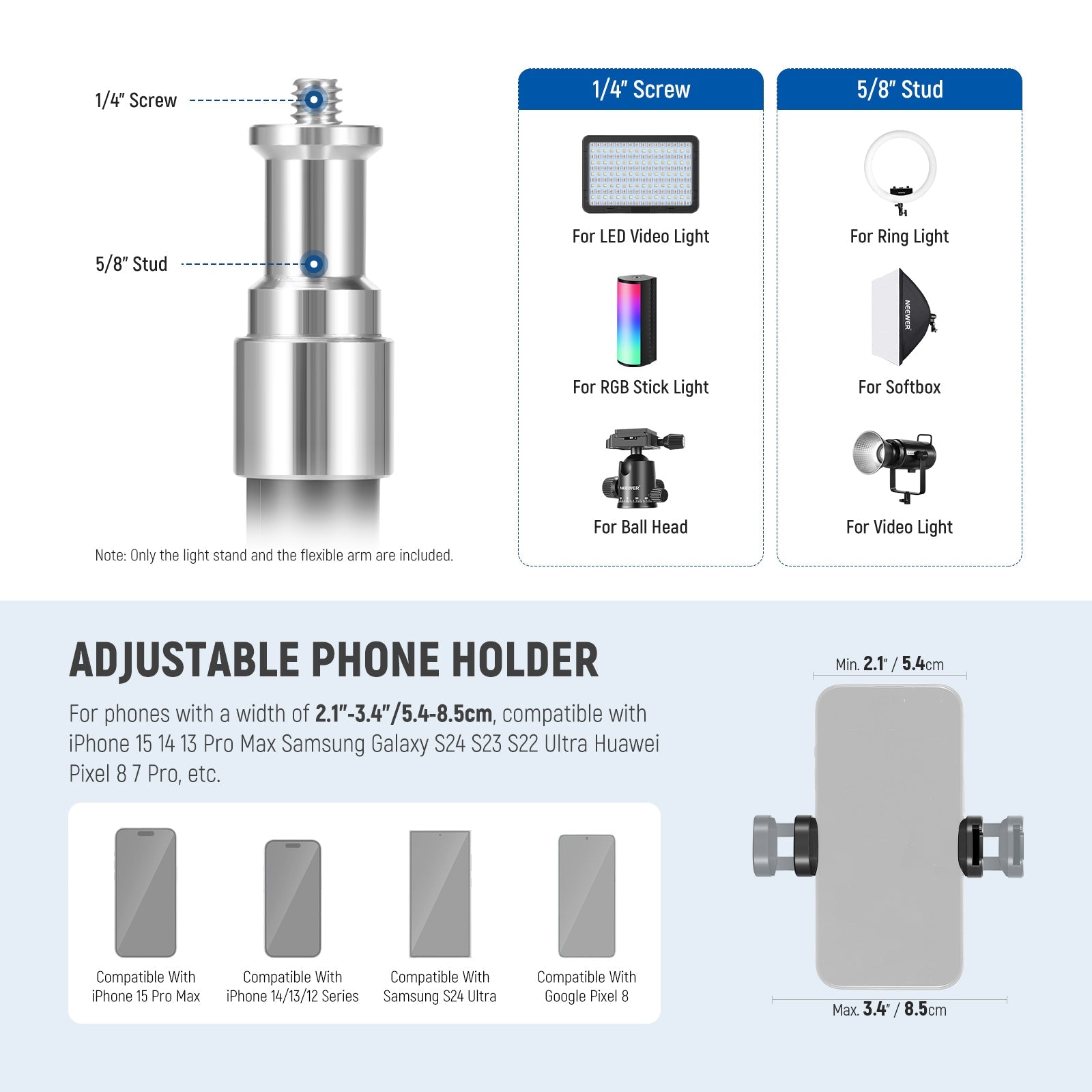 - 360° Ball Head & Flexible Arm- The 17.7"/45cm flexible arm introduces a remarkable level of adaptability that retains its shape even when bent, ensuring that your phone stays securely at any desired angle or height. The ball head enables smooth 360° rotation and tilt, and can be mounted at the top of the arm for more unique perspectives