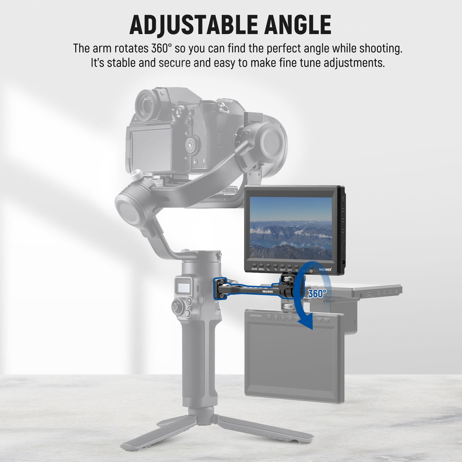 • 360° Smooth Rotation- With 360° damping rotation movement, it enables you to tilt and flip the field monitor for the most optimal positions. The damping is adjustable via an included L-shaped hex key