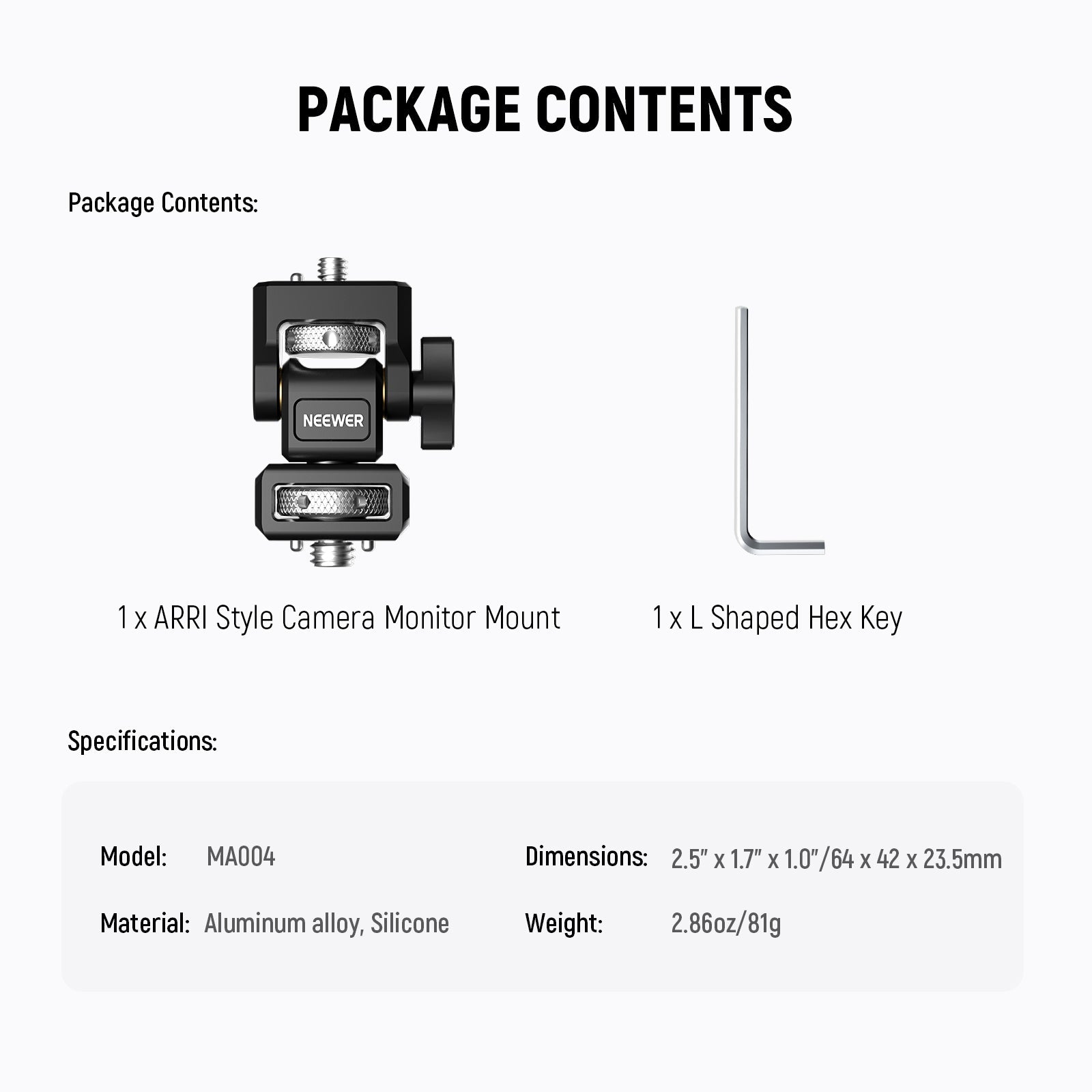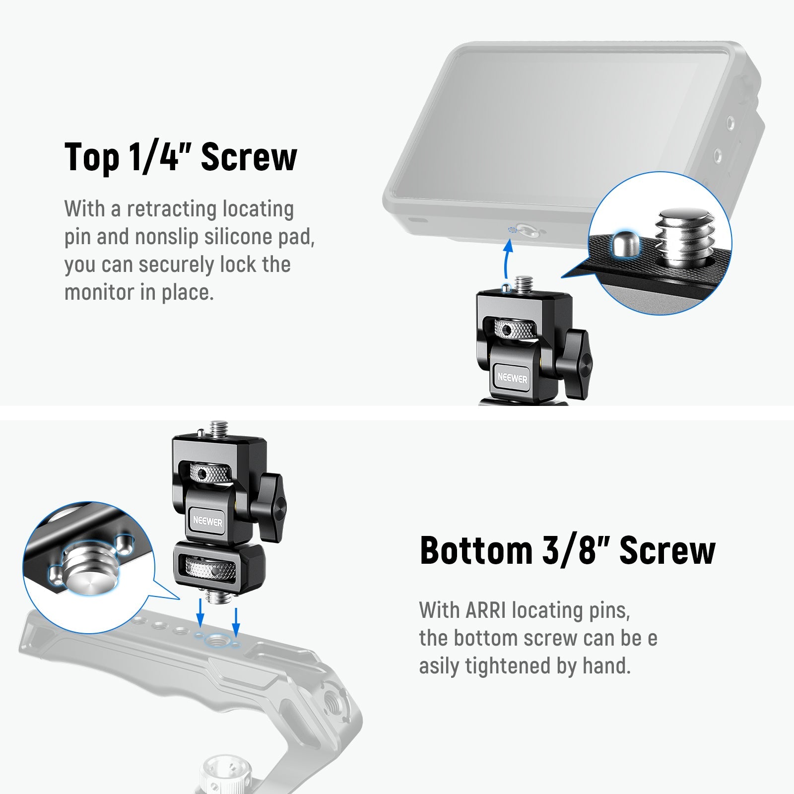 - ARRI Style Camera Monitor Mount- Designed to effortlessly and securely mount 5" and 7" camera monitors on the top of the camara cage (like NEEWER CA011, CA004, CA002). The bottom 3/8" knurled thumbscrew with ARRI locating pins can be easily tightened by hand. Seamless compatibility with SmallRig camera cages, video rigs, top handle and other accessories