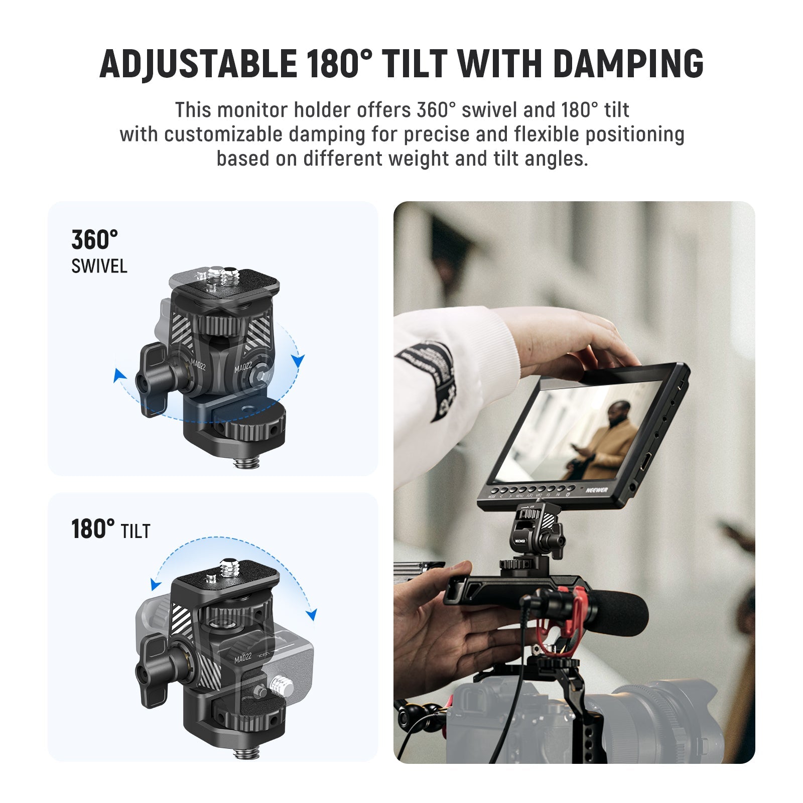 - Adjustable 360° Swivel & 180° Tilt- The field monitor mount offers 360° rotation and 180° tilt, with adjustable damping for various equipment weights and angles. The thumbscrew enables quick securing, with positioning holes that can be re tightened using the hex key for added stability