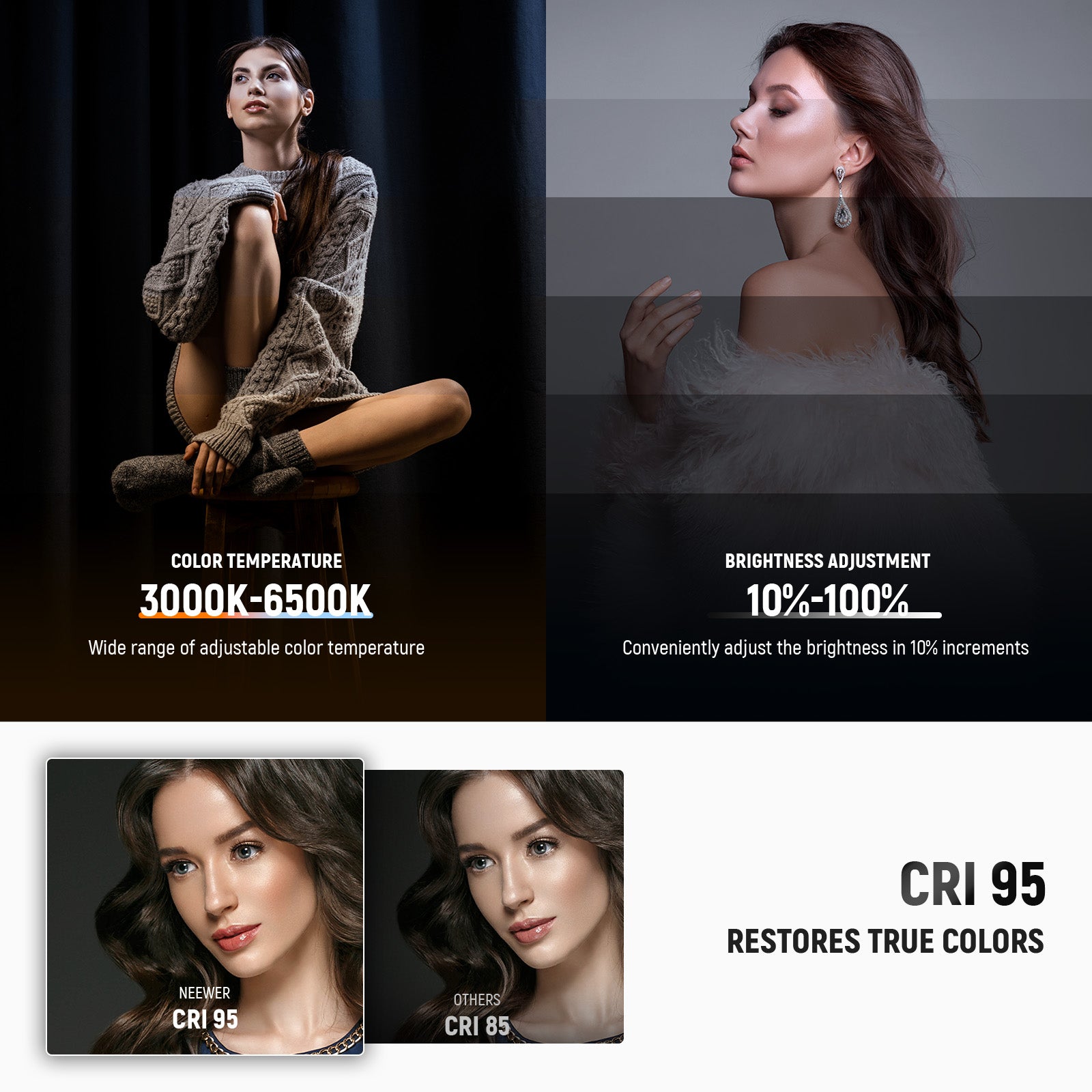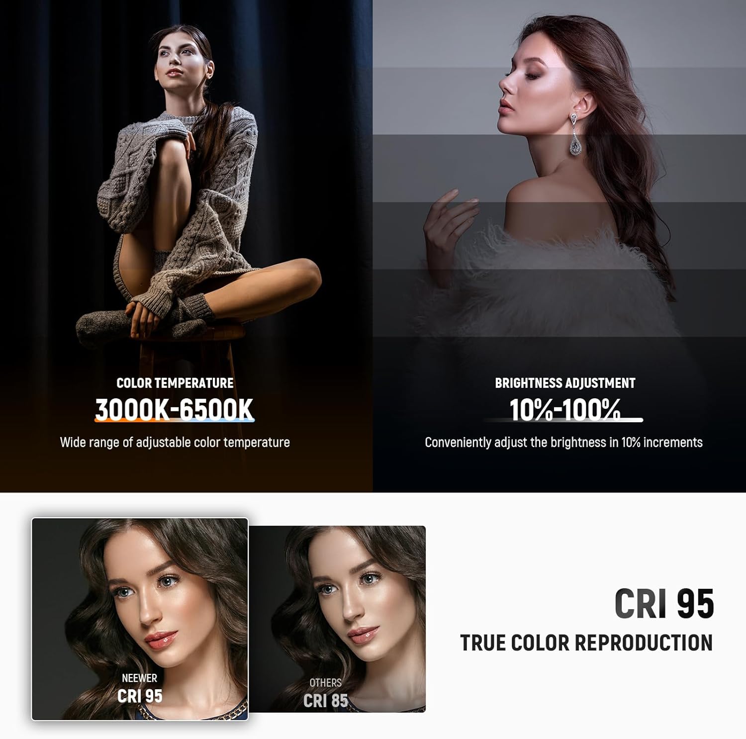 - 3000K-6500K Dimmable Circle Fill Light- This LED light for video recording offers a color temperature range of 3000K-6500K, allowing for a seamless transition from warm tones for a cozy vibe to cool tones for a professional setting. Brightness can be adjusted across 10 different settings, ranging from 10% to 100%, to suit different lighting conditions, whether bright or dim. The high color rendering index of 95 makes sure the original color and beauty are faithfully reproduced
