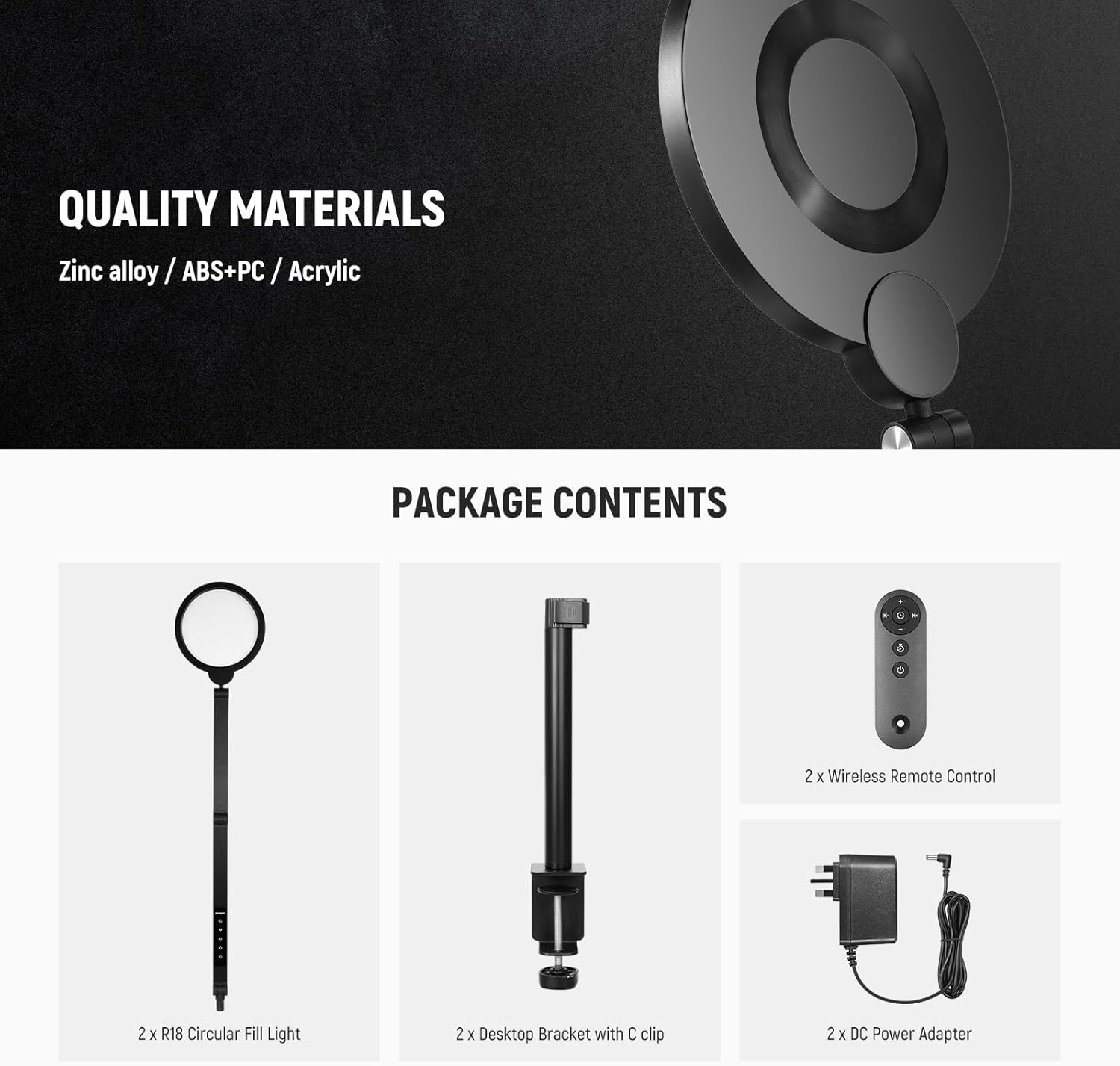- 18W Full Screen Streaming Key Ring Light- The R18 7" full screen LED fill light is equipped with 84 built in LEDs, delivering illumination of up to 1380lux/0.5m, offering widespread light coverage that surpasses traditional ring lights. The premium panel with edge lit technology ensures soft, uniform lighting without shadows, brightening your skin and concealing facial blemishes to help you look your best on camera
