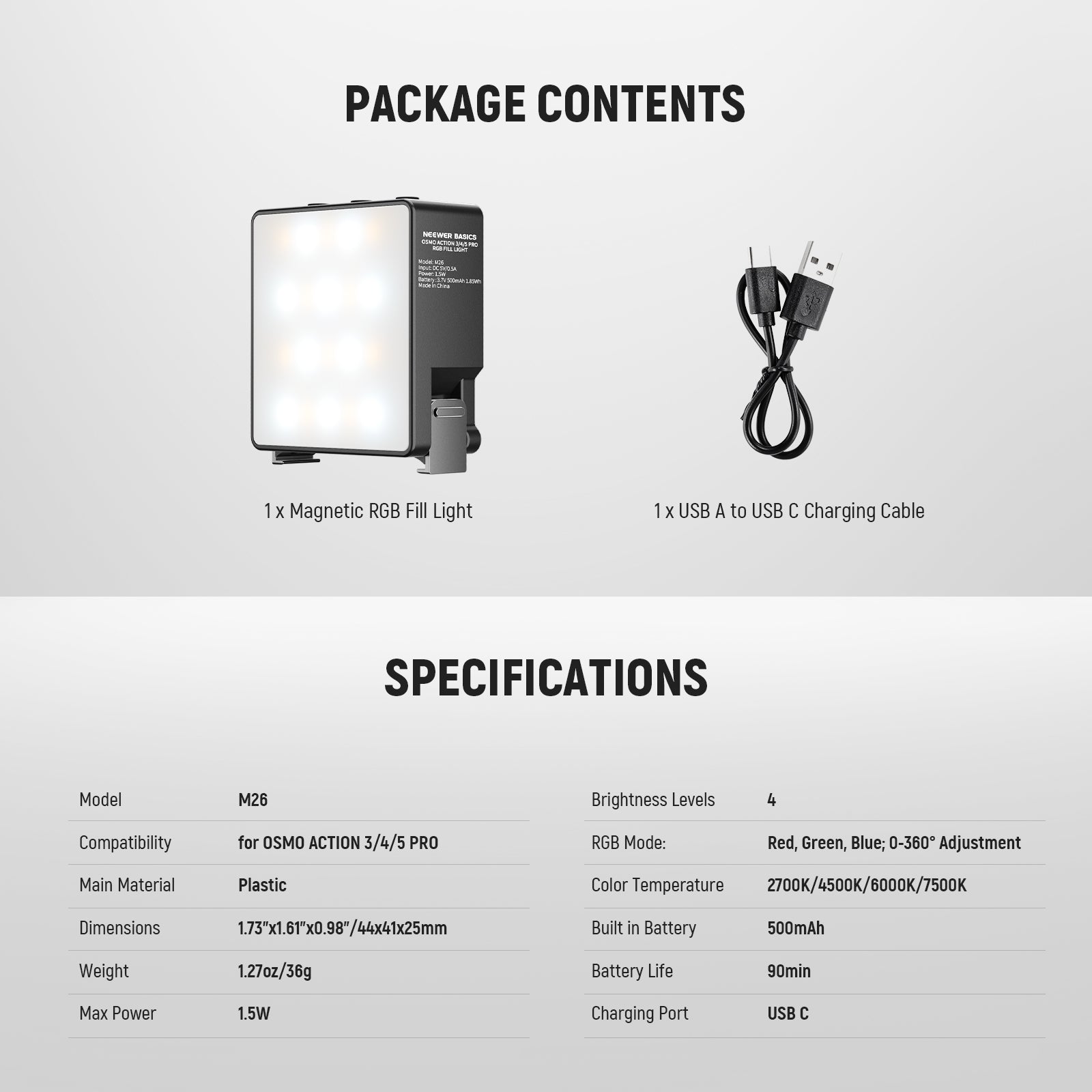 NEEWER BASICS M25/M26 Magnetic LED Light For DJI OSMO Nano Action 3/4/5 Pro
