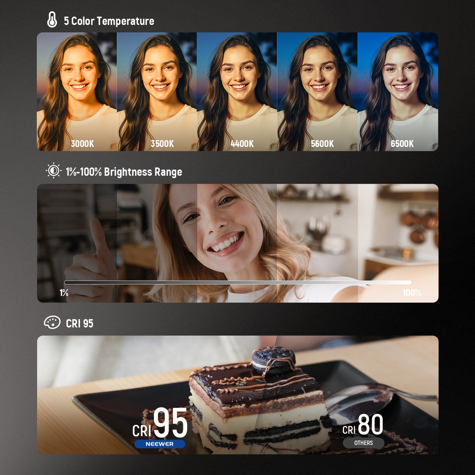 • Introducing NEEWER BASICS- Simple and practical, NEEWER BASICS is an economical product line that focuses on essential functions and designs, without unnecessary extras and materials. The NL48R photo light for photography is an ultra compact and portable phone selfie lighting, featuring 48 premium LEDs that provide 1160lx/0.2m illuminance with adjustable color temperature and brightness, and CRI95, designed to enhance your complexion and reduce facial blemishes to make you look better on camera