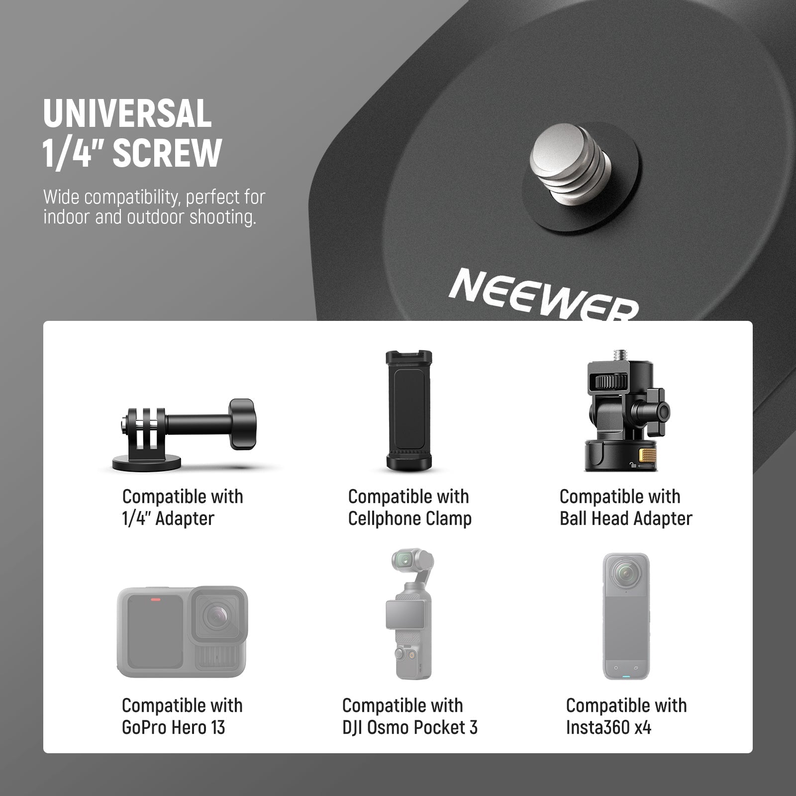 - For 1/4" Threaded Cameras- NEEWER AC016 magnetic camera mount features a universal 1/4" screw that mounts flush with gimbal cameras or action cameras with a standard 1/4" thread, compatible with DJI Osmo Pocket 3, and compatible with Insta360 X3/2/1. You can even use it to hold a magnetic cellphone for vlogging, live streaming, etc
