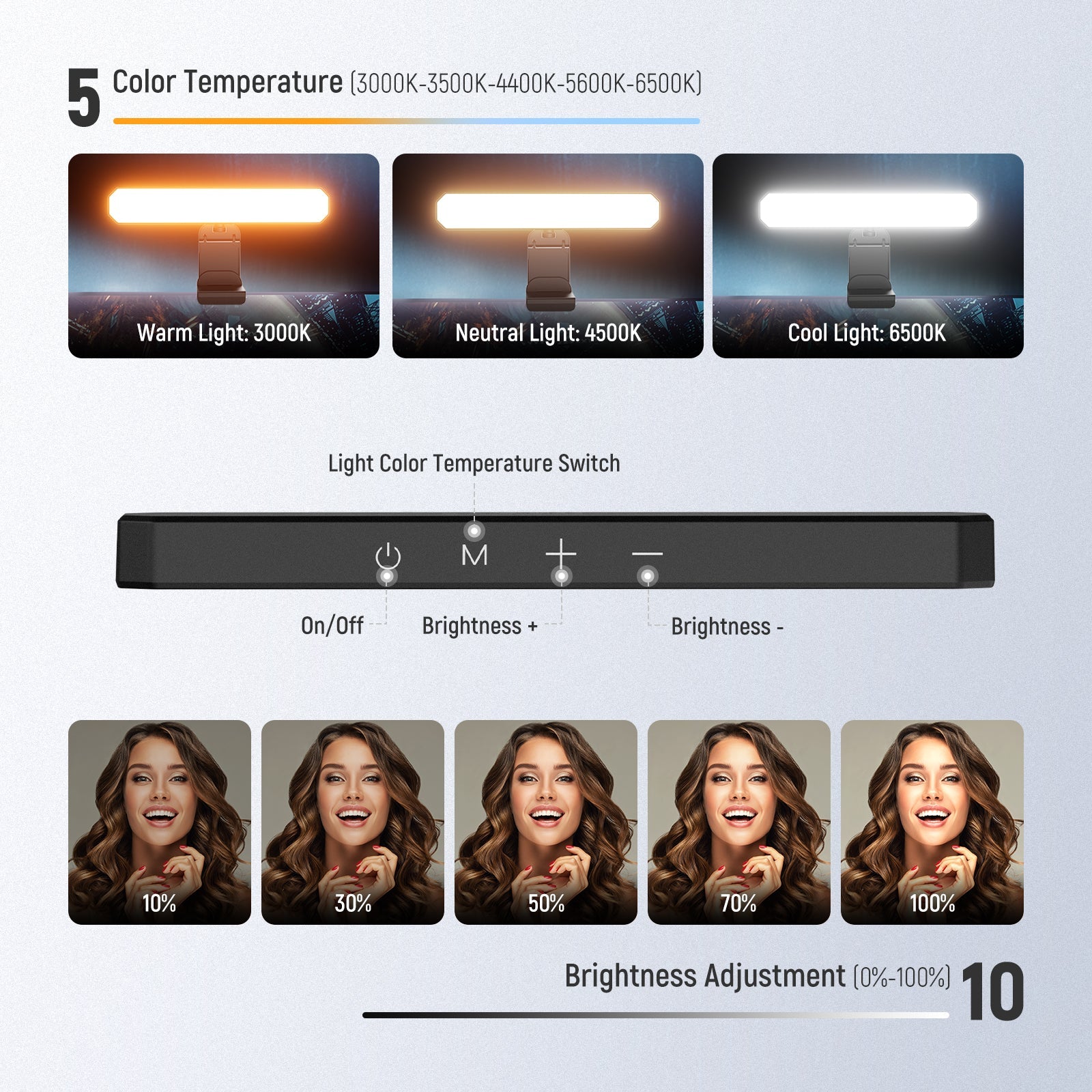 - Bi-Color & Dimmable Video Call Lights- The desk monitor tube light has built in 40 LEDs ( 20 warm & 20 cool LEDs) to to emit both warm and cool light. It offers 5 levels of color temperature (3000K, 3500K, 4400K, 5600K, and 6500K) and 10 brightness levels to accommodate different lighting conditions. The memory function retains the last used settings for color temperature and brightness, so you don't have to reset them unless necessary