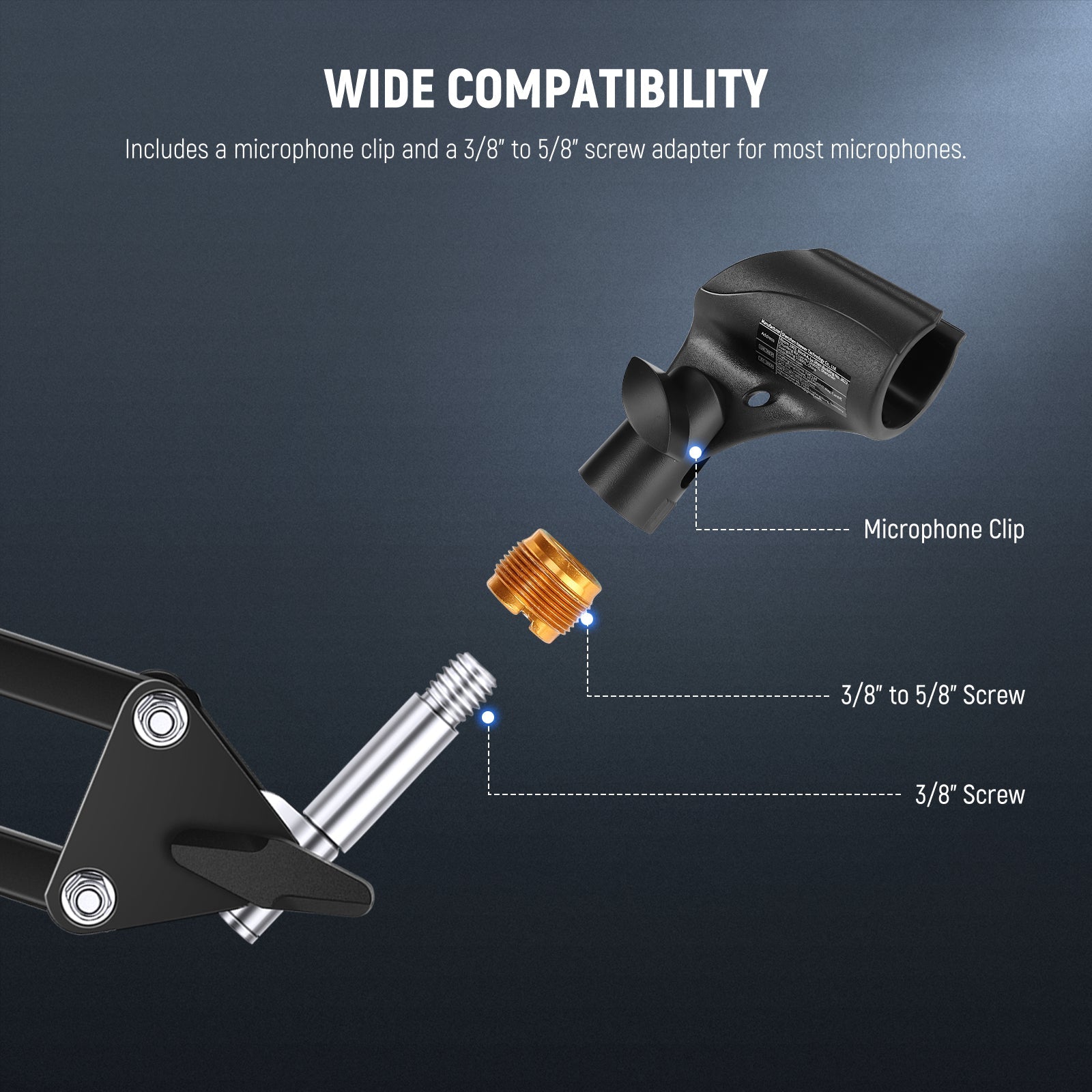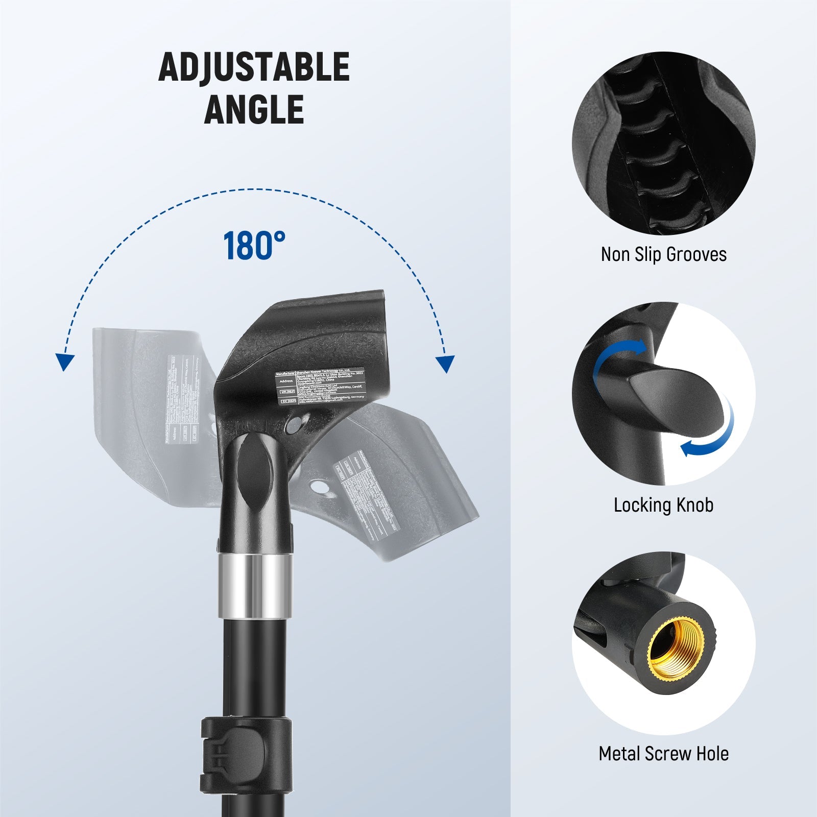 - Adjustable Microphone Holder- The microphone clip adjusts 180° back and forth for flexible positioning, with an angle locking screw to secure the microphone after adjustment, ensuring a stable grip and preventing slips during use