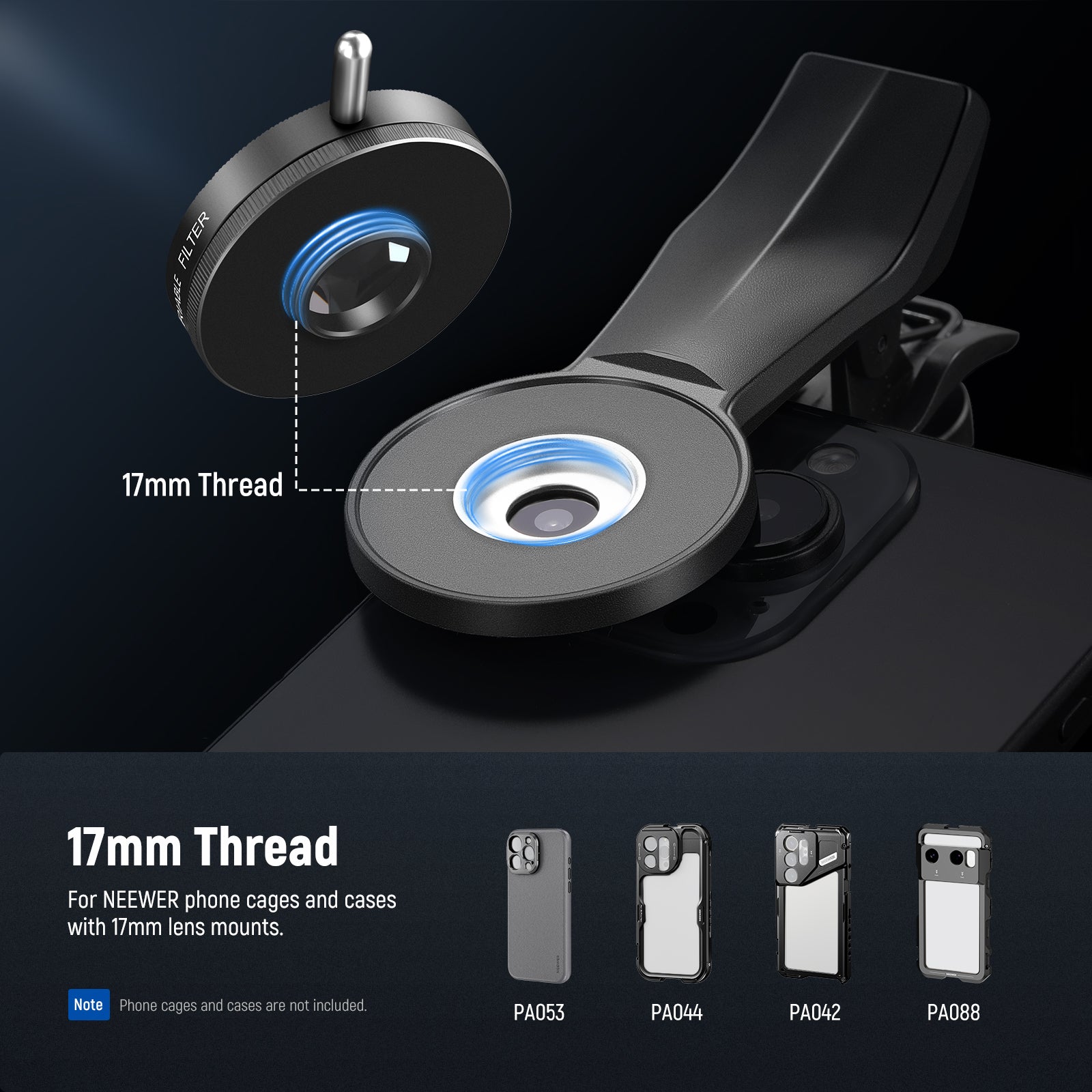 - 17mm Threaded Phone Clip- The included 17mm threaded phone clip lets you attach the lens filter to compatible phone holders, cases, or backplates compatible with iPhone Android phones for enhanced mobile photography and videography as content creator essential gear and influencer must have cell phone camera accessories