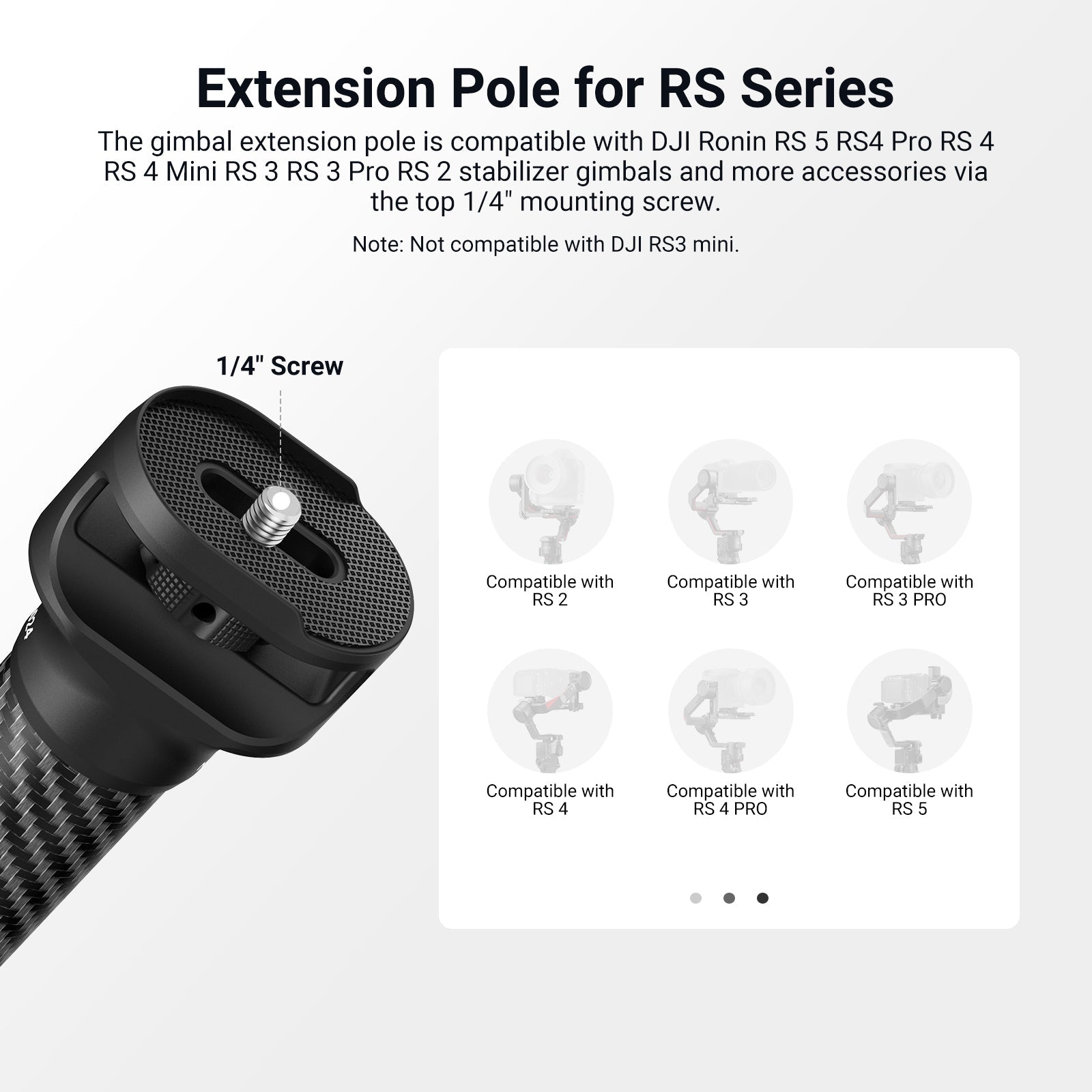 • Extension Pole for RS Series- The gimbal extension pole is compatible with DJI Ronin RS 5 RS4 Pro RS 4 RS 4 Mini RS 3 RS 3 Pro RS 2 stabilizer gimbals and more accessories via the top 1/4" mounting screw. Note: Not compatible with DJI RS3 mini