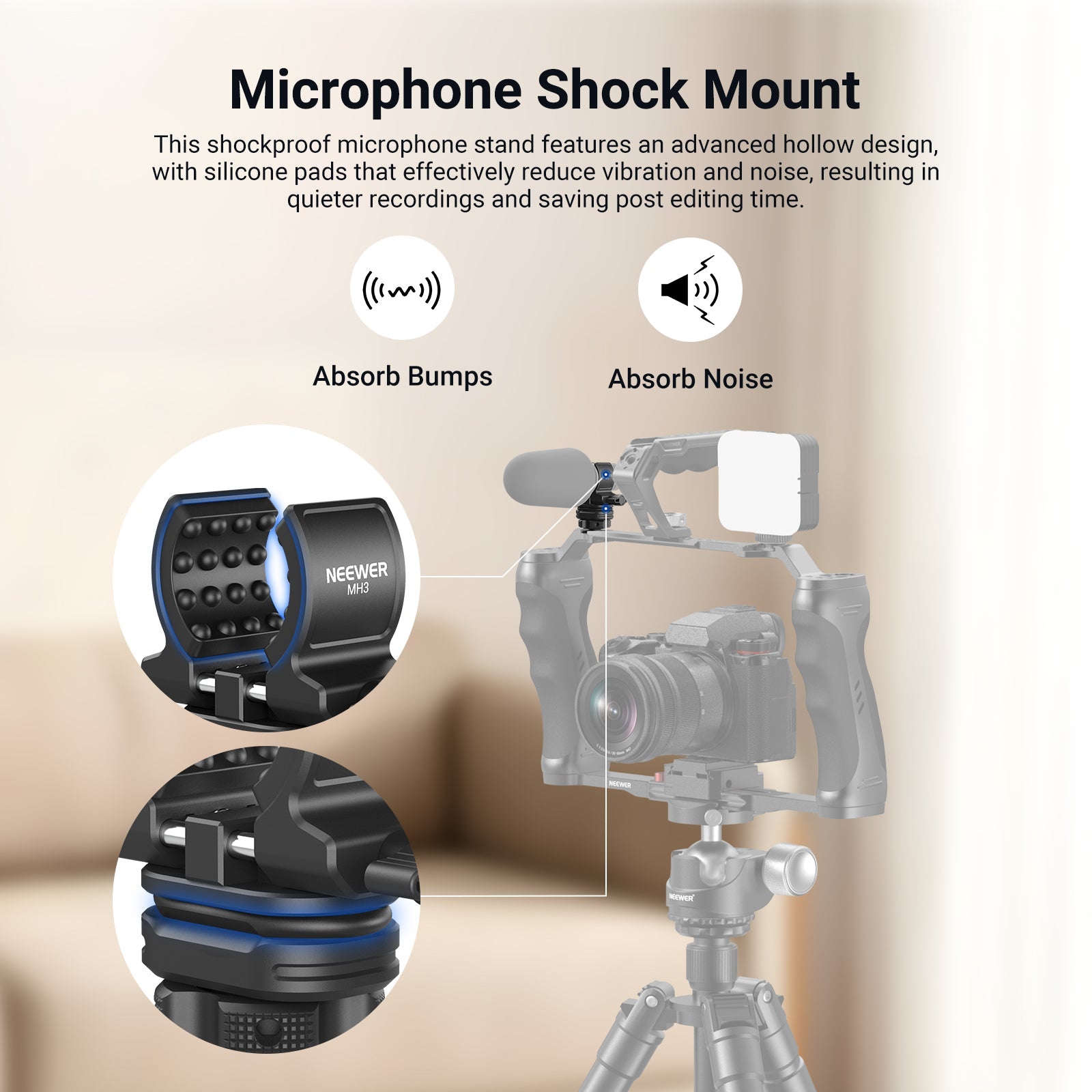 - Microphone Shock Mount- The shock mount mic holder features an advanced hollow design for the silicone pads within the microphone clamp, efficiently reducing vibrations and noise for quieter recordings and saving time for post editing