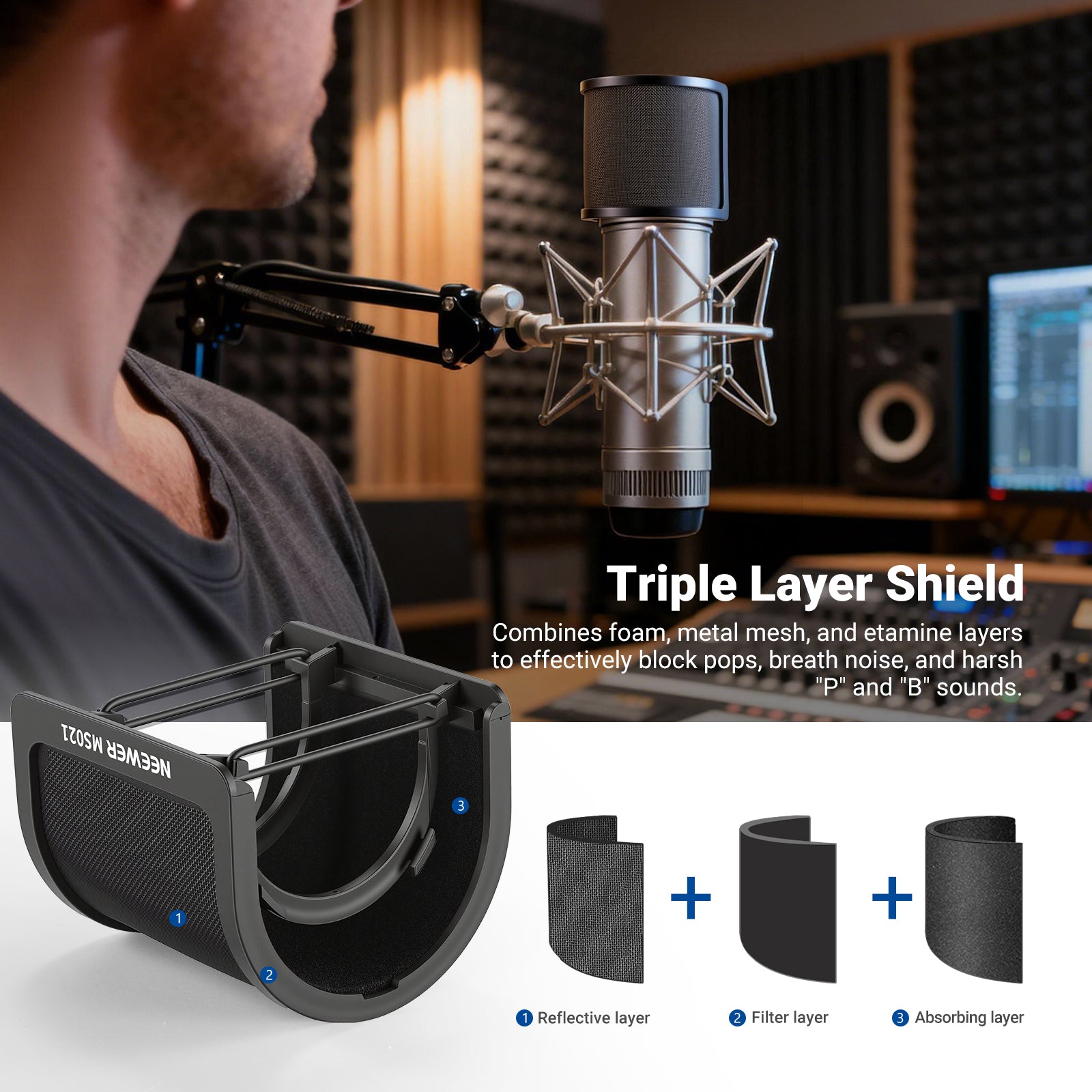 - Triple Layer Shield for Crystal Clear Sound- Combines foam, metal mesh, and etamine layers to effectively block pops, breath noise, and harsh “P” and “B” sounds. Giving you smooth, studio grade audio every time