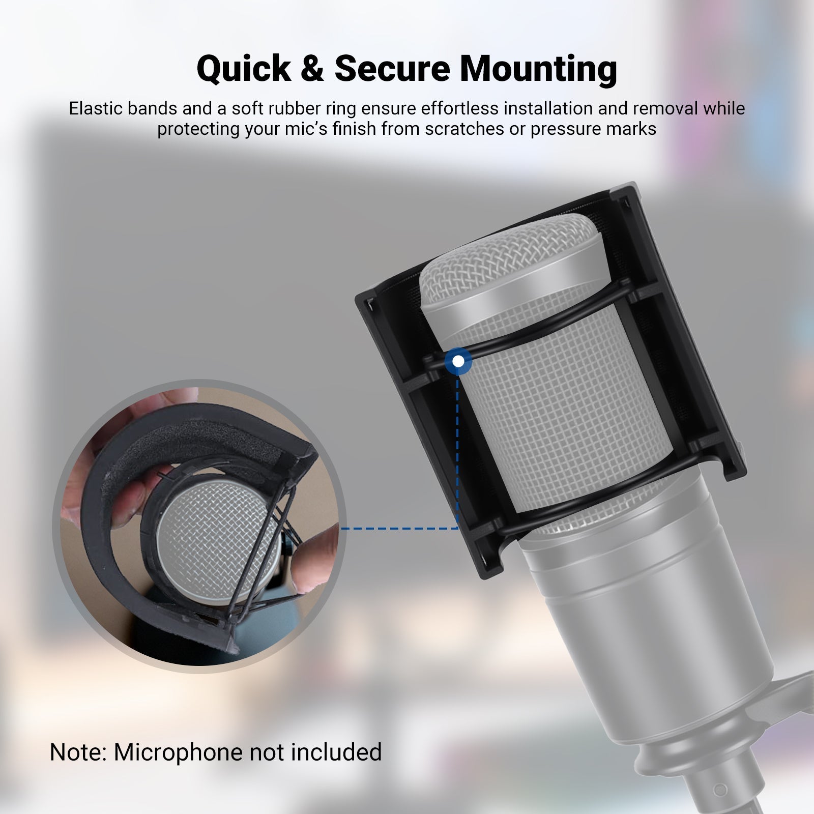 - Quick & Secure Mounting- Elastic bands and a soft rubber ring ensure effortless installation and removal while protecting your mic’s finish from scratches or pressure marks