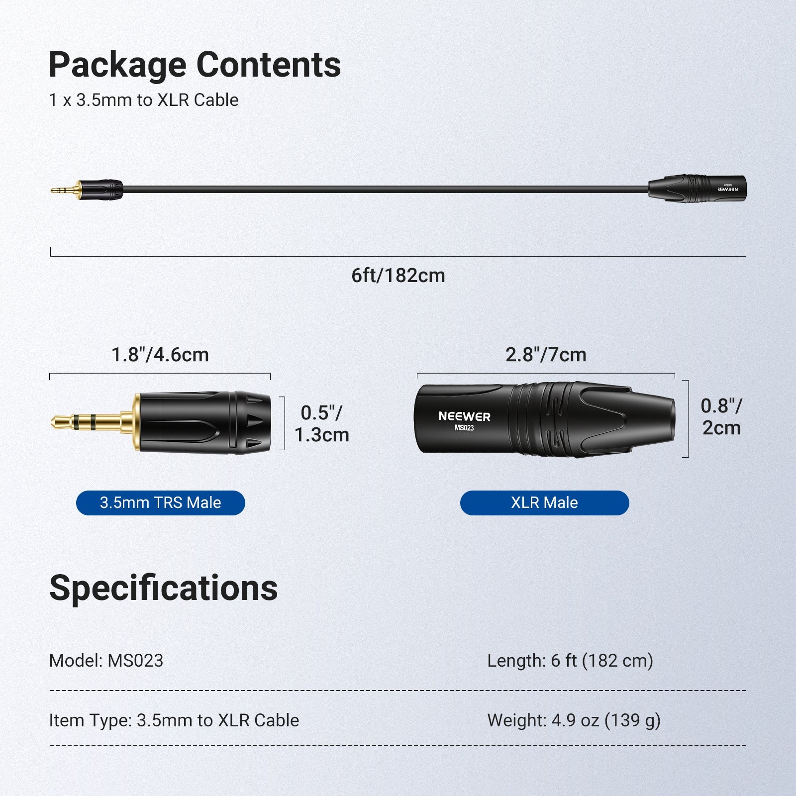 - 3.5mm to XLR Male Cable- Use the xlr to 1/8" male to male cable to connect your smartphone, tablet, or laptop to the mixing console or powered speaker with an XLR male connector, ensuring efficient stereo to mono signal transmission