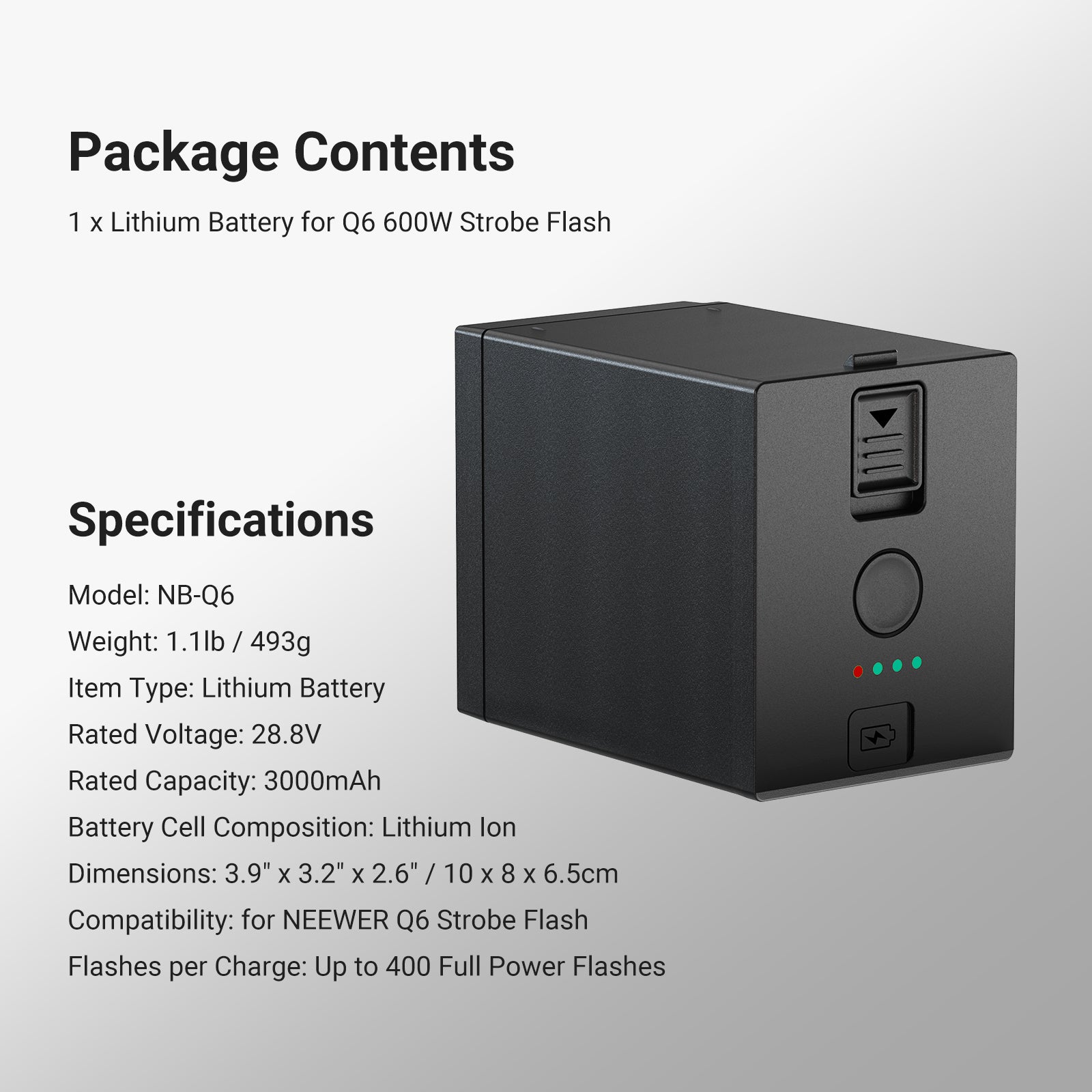 Product overview of the NEEWER NB-Q6 Lithium Battery For Q6 600W Strobe Flash