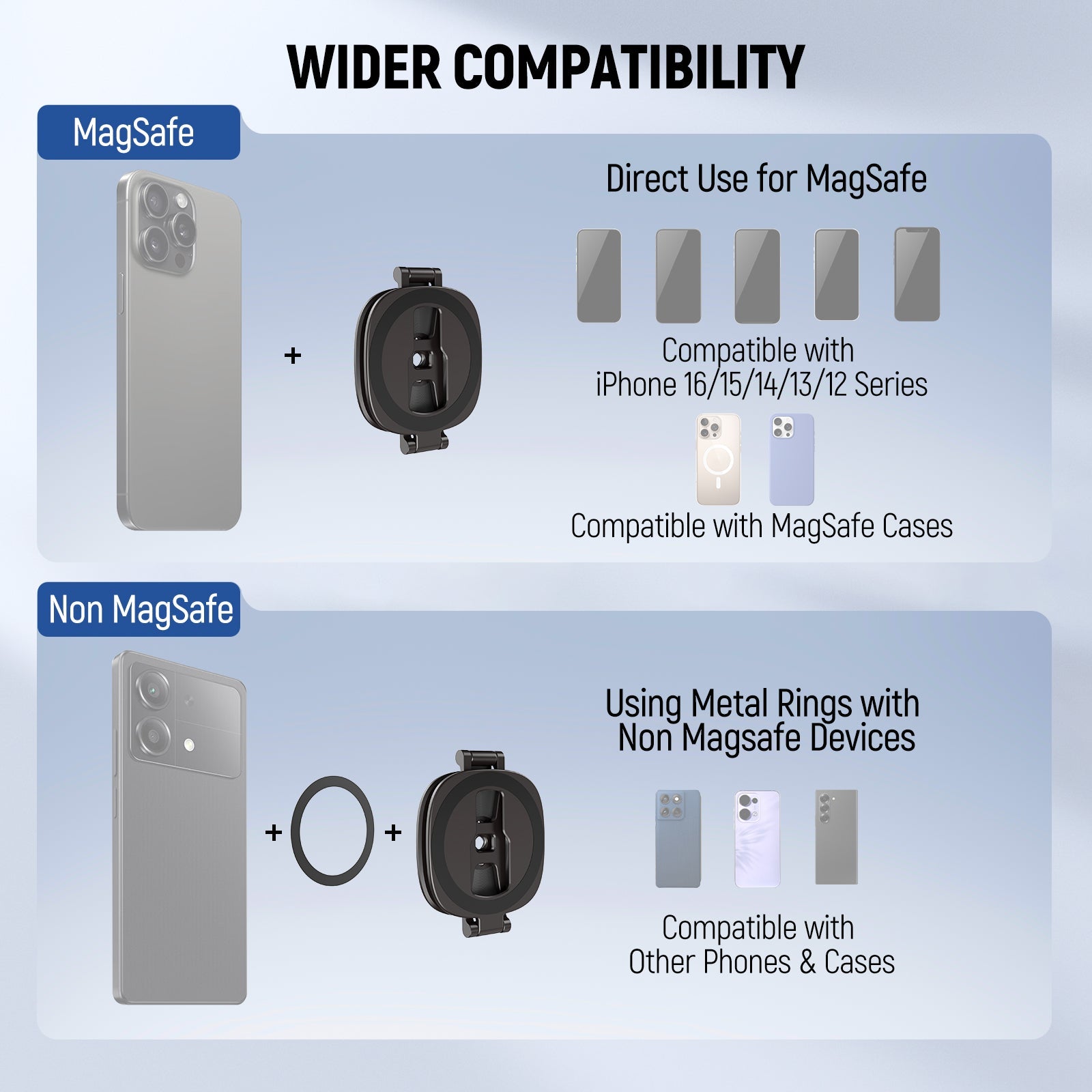 - Wider Compatibility- The foldable tripod mount adapter for phone camera photography accessories is fully compatible with MagSafe system, and thus compatible with iPhone 16 15 Pro Max Plus 14 13 12 series, the Mag Safe compatible phone case covers and NEEWER PA006 PA011 PA023 PA024 cages for iPhone 15 14 Pro and Pro Max. For non MagSafe phones, use the included ring magnet for phone case, expanding compatibility with Samsung Galaxy S24 S23 S22 Ultra Google Pixel 9 8 7 Pro Huawei, etc.
