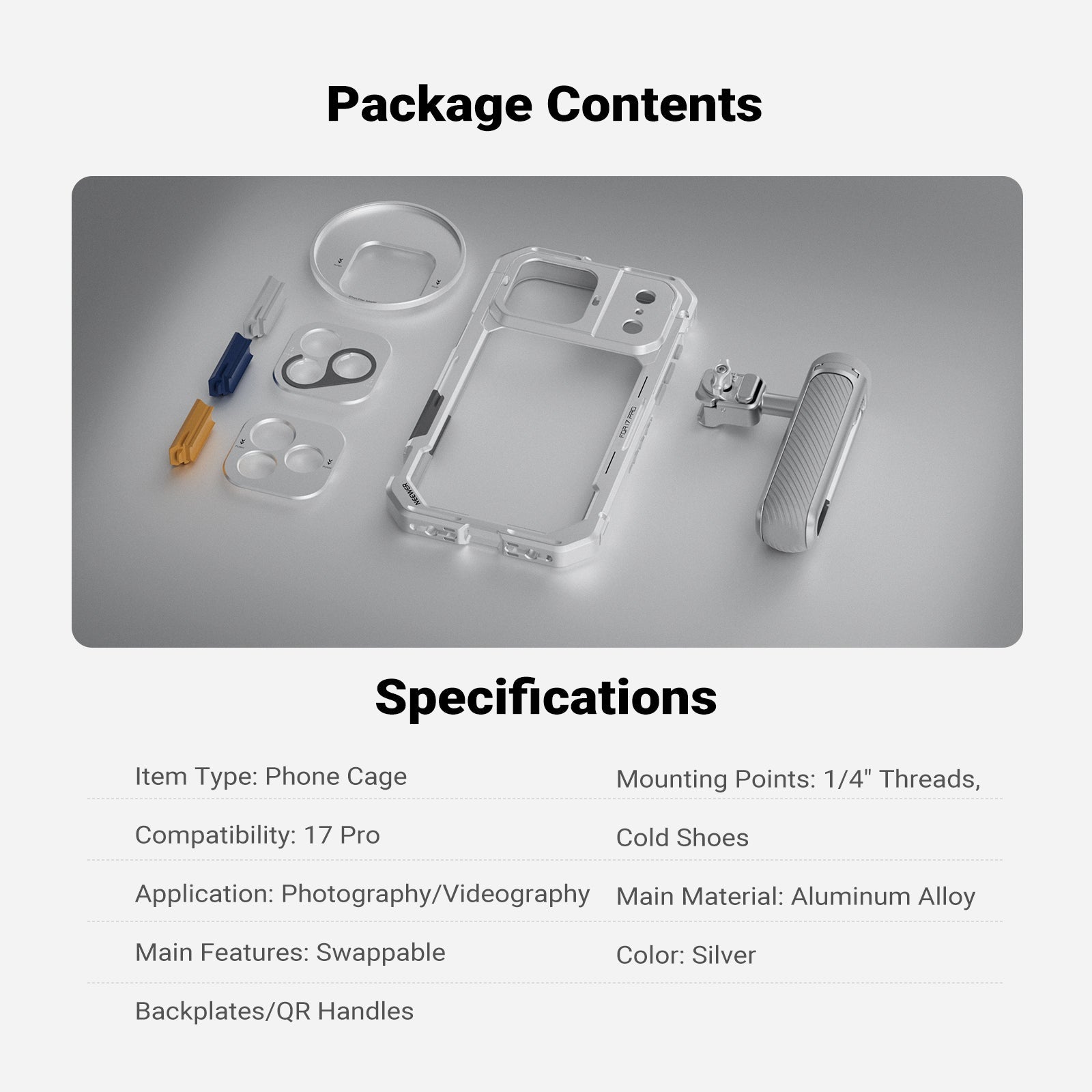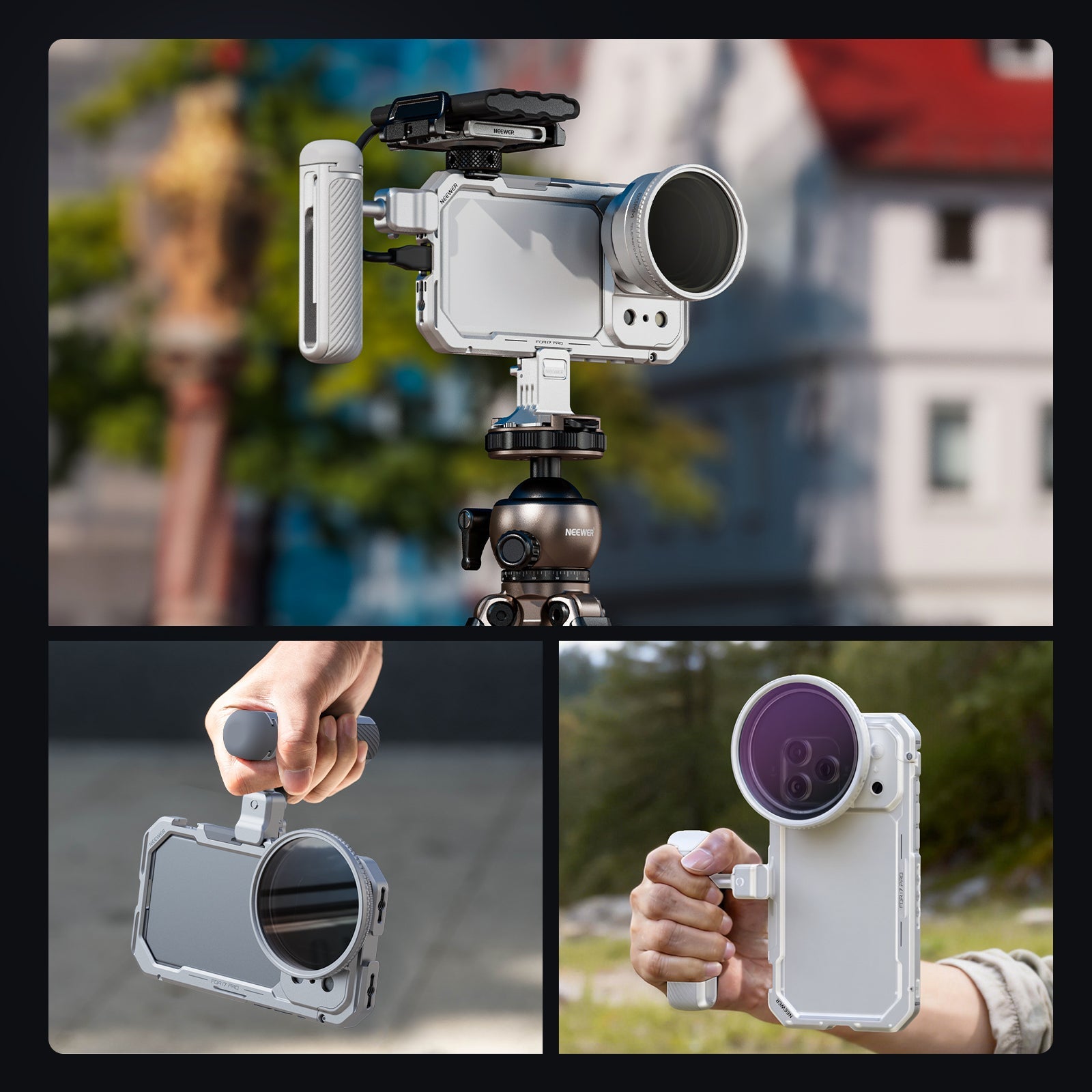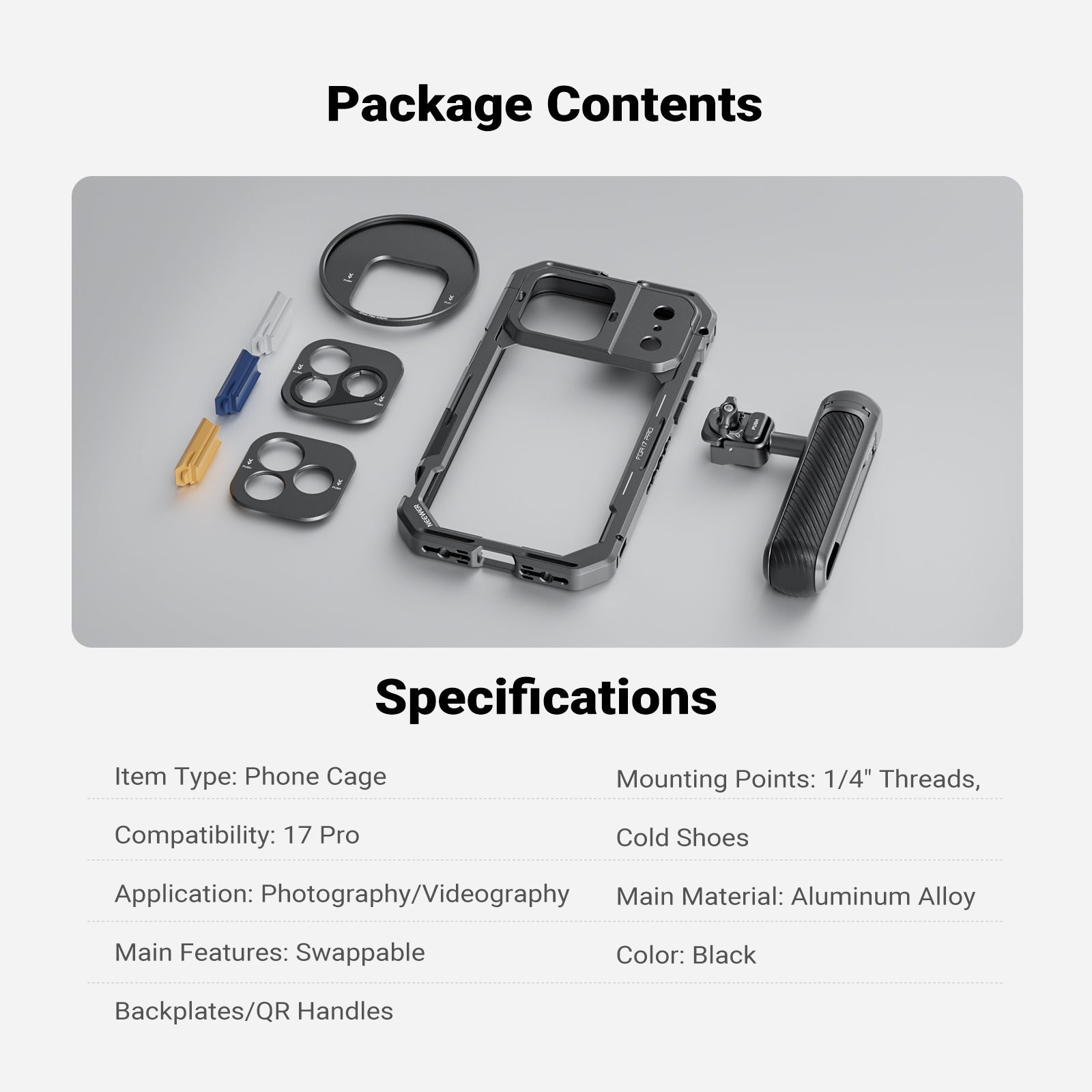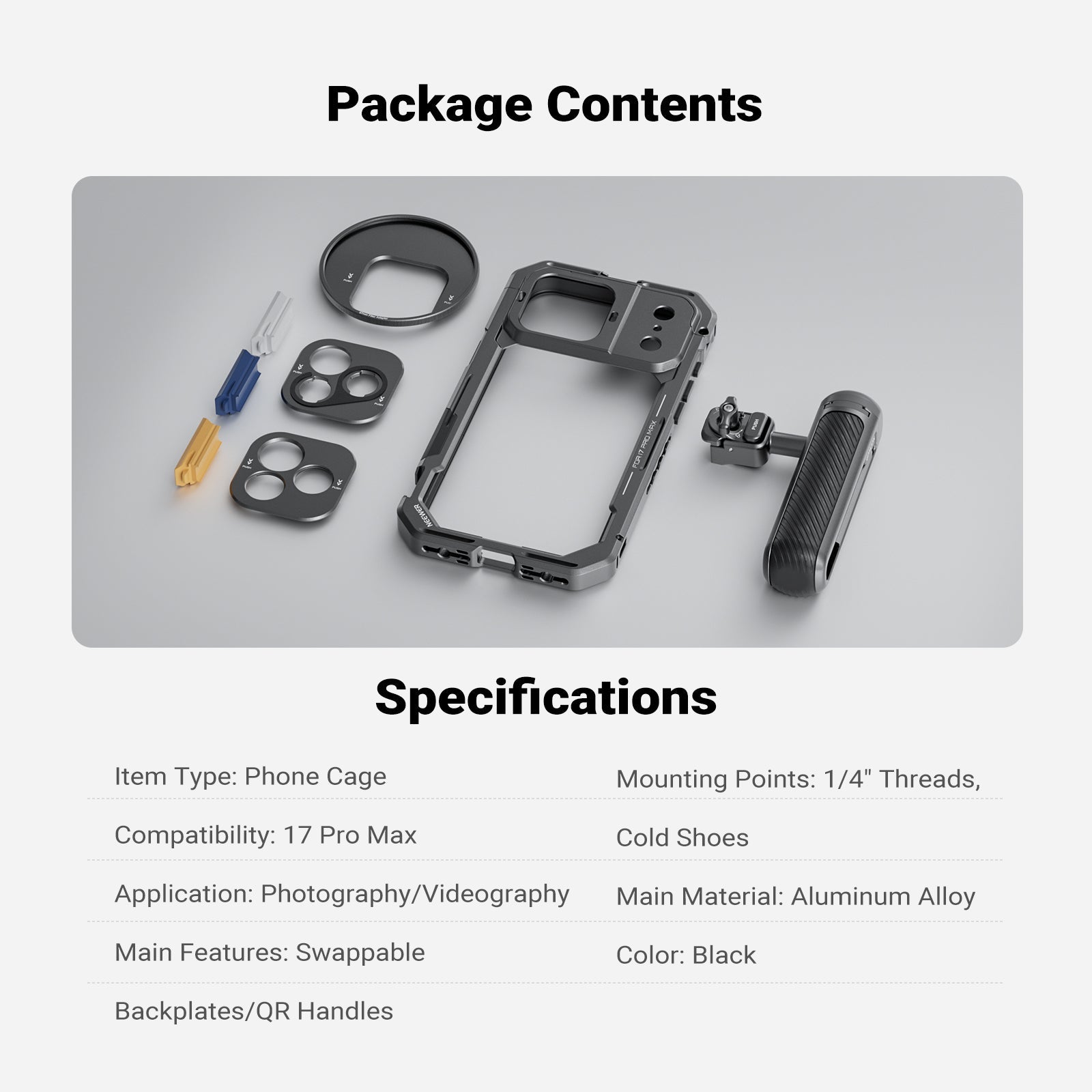 • Phone Cage for iPhone 17 Pro/Pro Max- Exclusively compatible with iPhone 17 Pro/Pro Max, the strong aluminum alloy video rig with shockproof rubber lining protects your cell phone during outdoor use