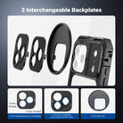 • 3 Interchangeable Backplates- With a 67mm filter ring, 17mm threaded phone lens backplate, and T mount lens backplate (compatible with Moment) for creative shots. Note: Open top bracket before mounting backplates. Filters and lenses not included