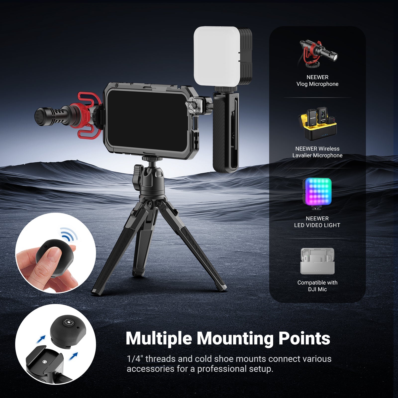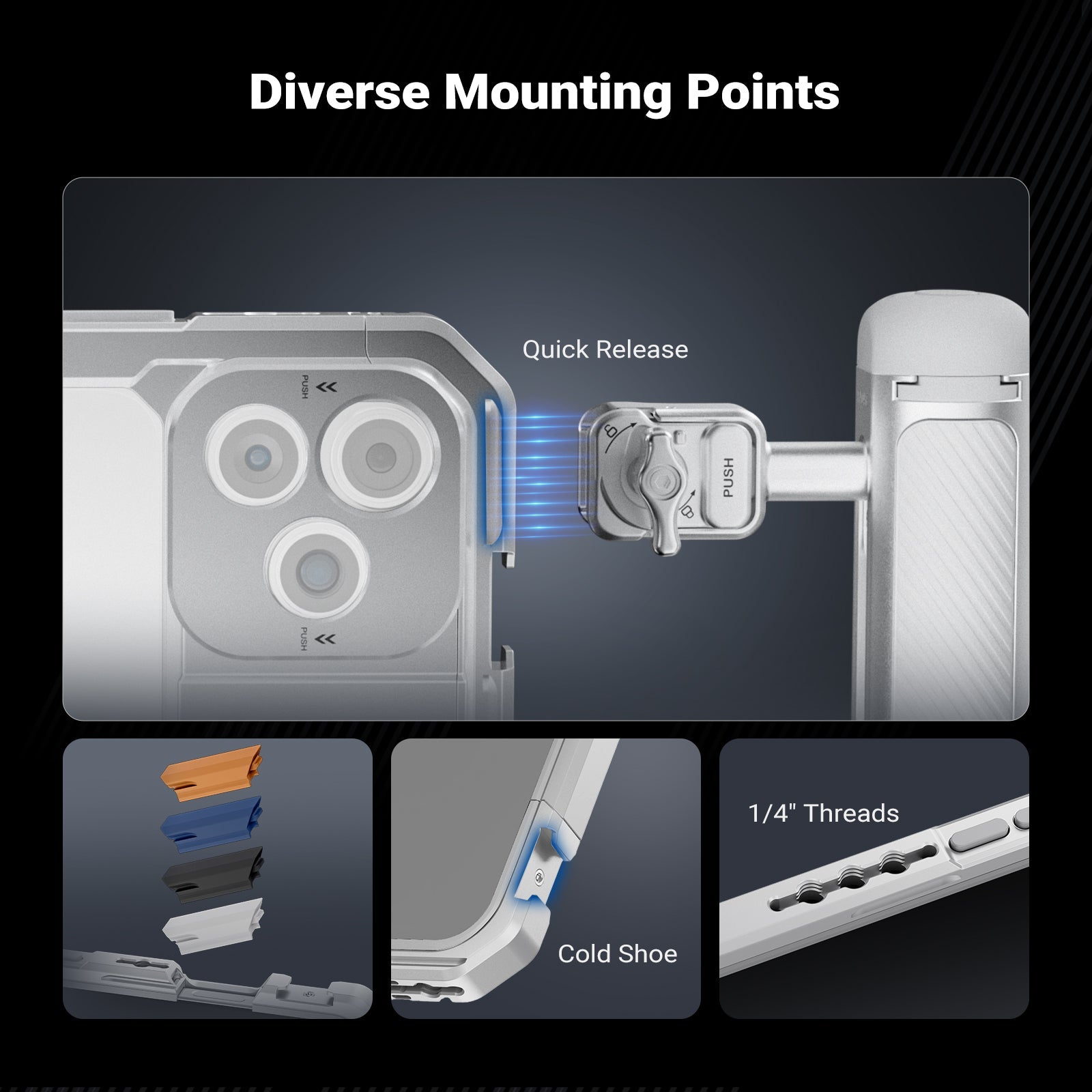 • Multiple Mounting Points- This cage compatible with iPhone 17 Pro/Pro Max features 1/4" threads and cold shoe mounts for tripods, handgrips, handle grips, LED lights, wireless mics, gimbal stabilizer holder equipment for phone camera video recording, plus other content creator essentials, influencer must haves, and mobile photography and filming accessories